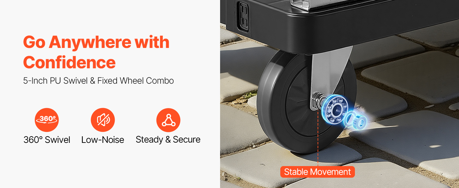 Vďaka veľkým otočným a pevným kolieskam sa tento skladací vozík s plochou ložnou plochou hladko kĺže a ľahko otáča. Zostáva stabilný na rôznych povrchoch v interiéri aj exteriéri.