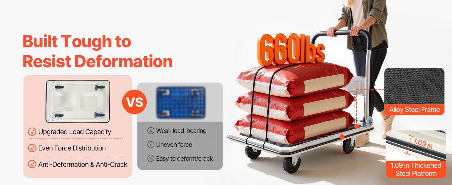 Tento skladací vozík s platformou je vyrobený z vystuženého rámu z legovanej ocele a ponúka dlhú životnosť. Odoláva ohybu pod ťažkým nákladom, je ideálny na presun ťažkých domácich predmetov alebo skladovanie tovaru v malých obchodoch bez deformácie.