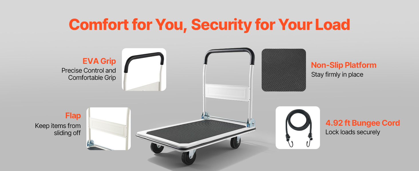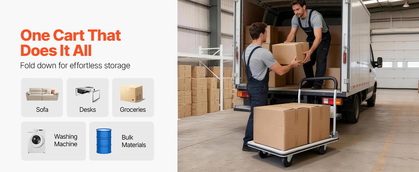 Od domácich prác a doplňovania zásob v obchode až po presun kancelárskeho vybavenia, tento skladací vozík s plochou ložnou plochou a kolieskami zvládne všetko. Jeden vozík pokryje viac úloh s menšou námahou.