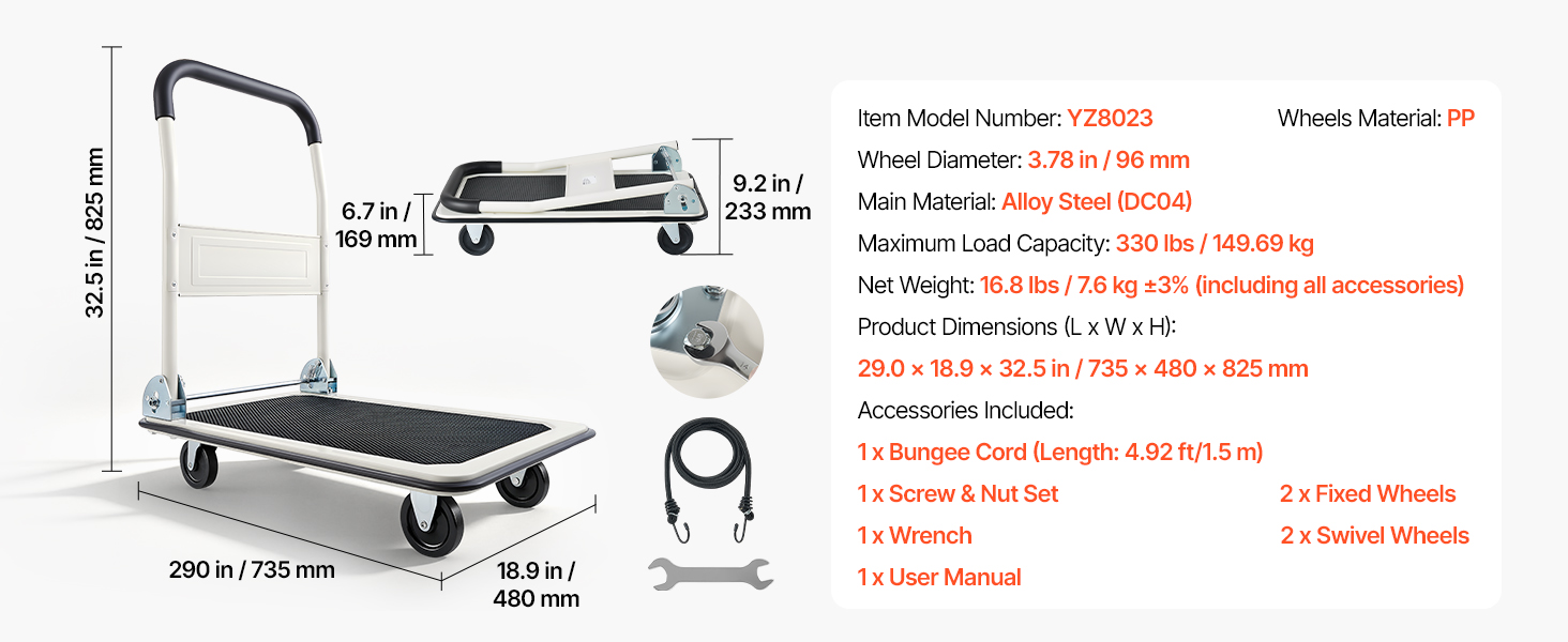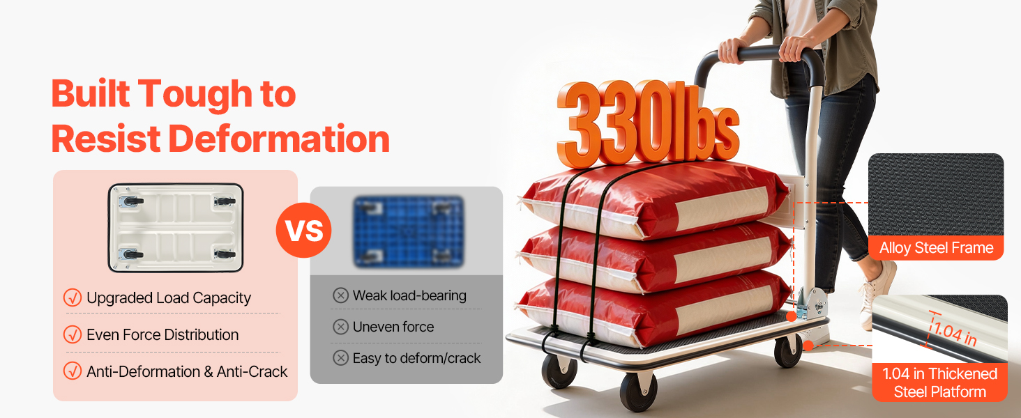 Tento skladací vozík s platformou je vyrobený z vystuženého rámu z legovanej ocele a ponúka dlhú životnosť. Odoláva ohybu pod ťažkým nákladom, je ideálny na presun ťažkých domácich predmetov alebo skladovanie tovaru v malých obchodoch bez deformácie.