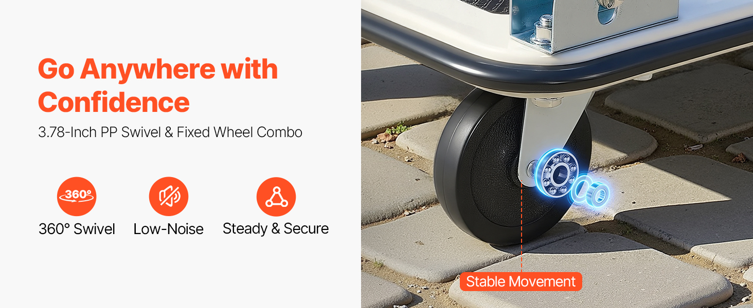 Vďaka veľkým otočným a pevným kolieskam sa tento skladací vozík s plochou ložnou plochou hladko kĺže a ľahko otáča. Zostáva stabilný na rôznych povrchoch v interiéri aj exteriéri.