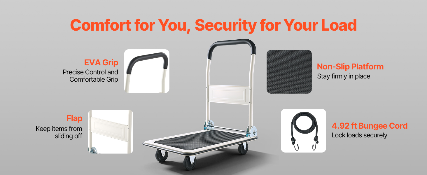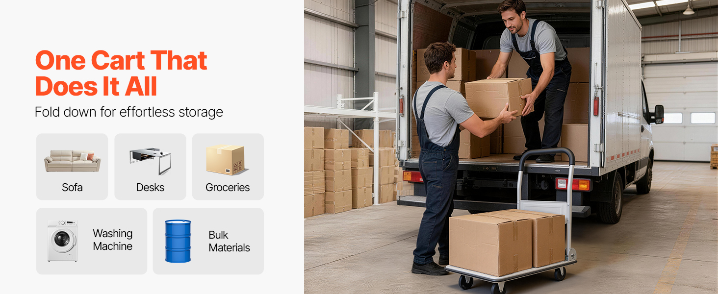Od domácich prác a doplňovania zásob v obchode až po presun kancelárskeho vybavenia, tento skladací vozík s plochou ložnou plochou a kolieskami zvládne všetko. Jeden vozík pokryje viac úloh s menšou námahou.