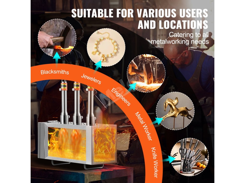 Ovládajte silu ohňa a teplotu len pomocou troch nastavení. Naše plynové kováčske výhne na kováčstvo vyhovujú rôznym potrebám kovania kovov vrátane zlata, striebra, nehrdzavejúcej ocele, ocele, mosadze, bronzu, horčíka, hliníka, zliatin, olova, cínu a ďalších.