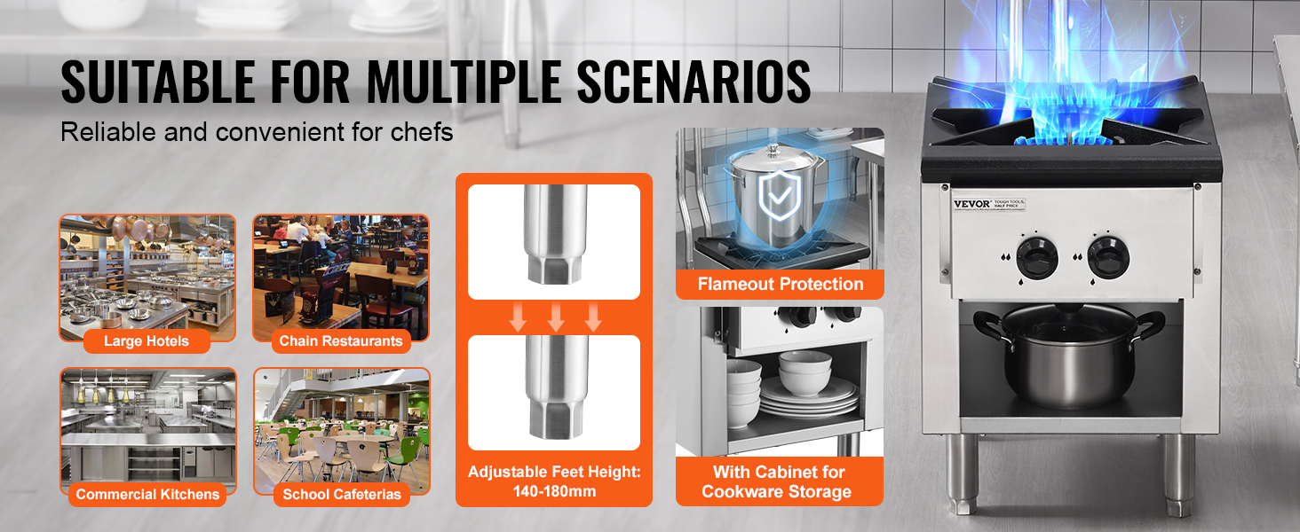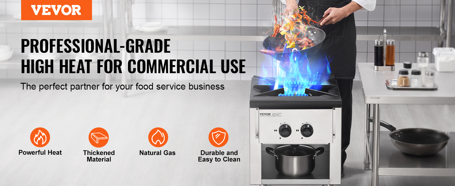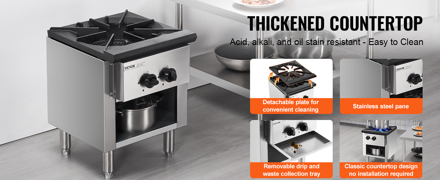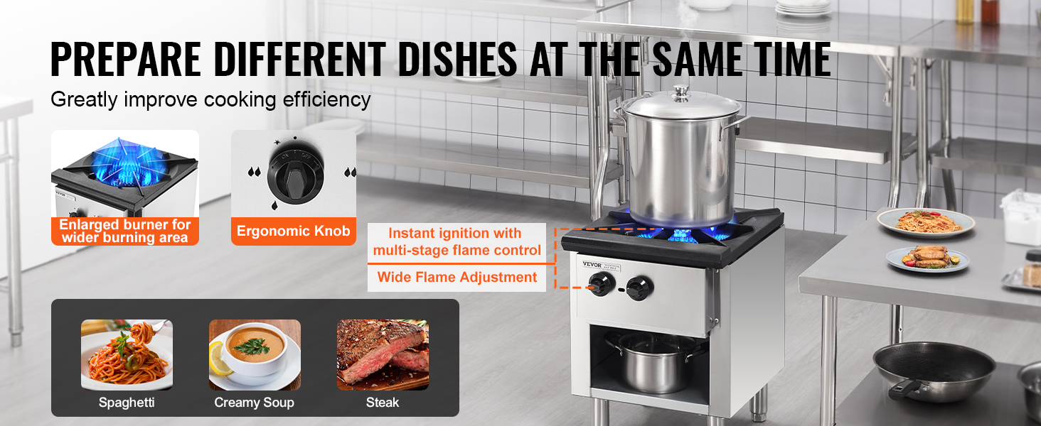 Komerčný plynový sporák je vybavený ergonomickým gombíkom na široké nastavenie plameňa. Vyberte si požadovaný plameň, okamžite ho zapáľte a použite ergonomický gombík na ovládanie bez námahy. Ľahko pripravíte rôzne pokrmy.