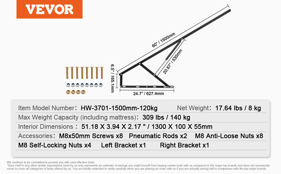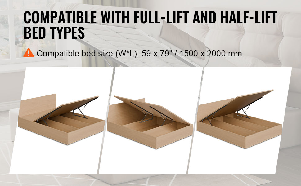 Táto hydraulická súprava na zdvíhanie postelí je vhodná pre rozkladacie pohovky alebo postele s rozmermi 59 × 71". Mechanizmus možno orientovať tak, aby sa otváral z boku alebo z konca postele.
