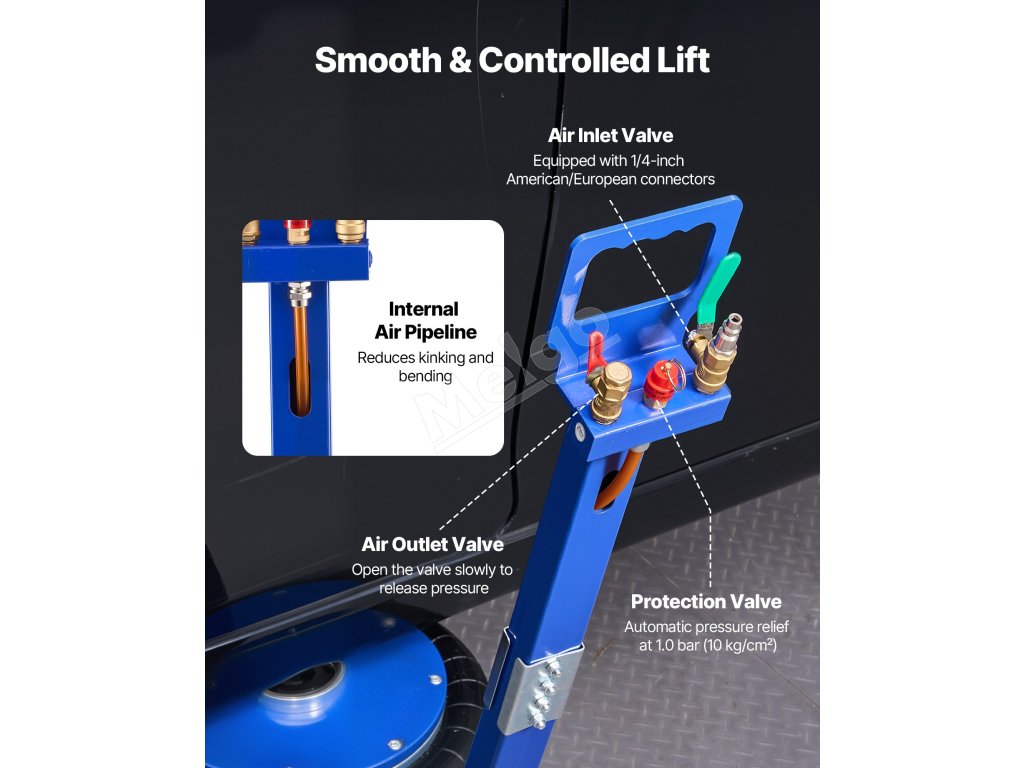 Náš vzduchový zdvihák je vyrobený z vysokokvalitnej ocele s elektrostatickým práškovým náterom, ktorý zaručuje odolnosť proti korózii a dlhodobé používanie.