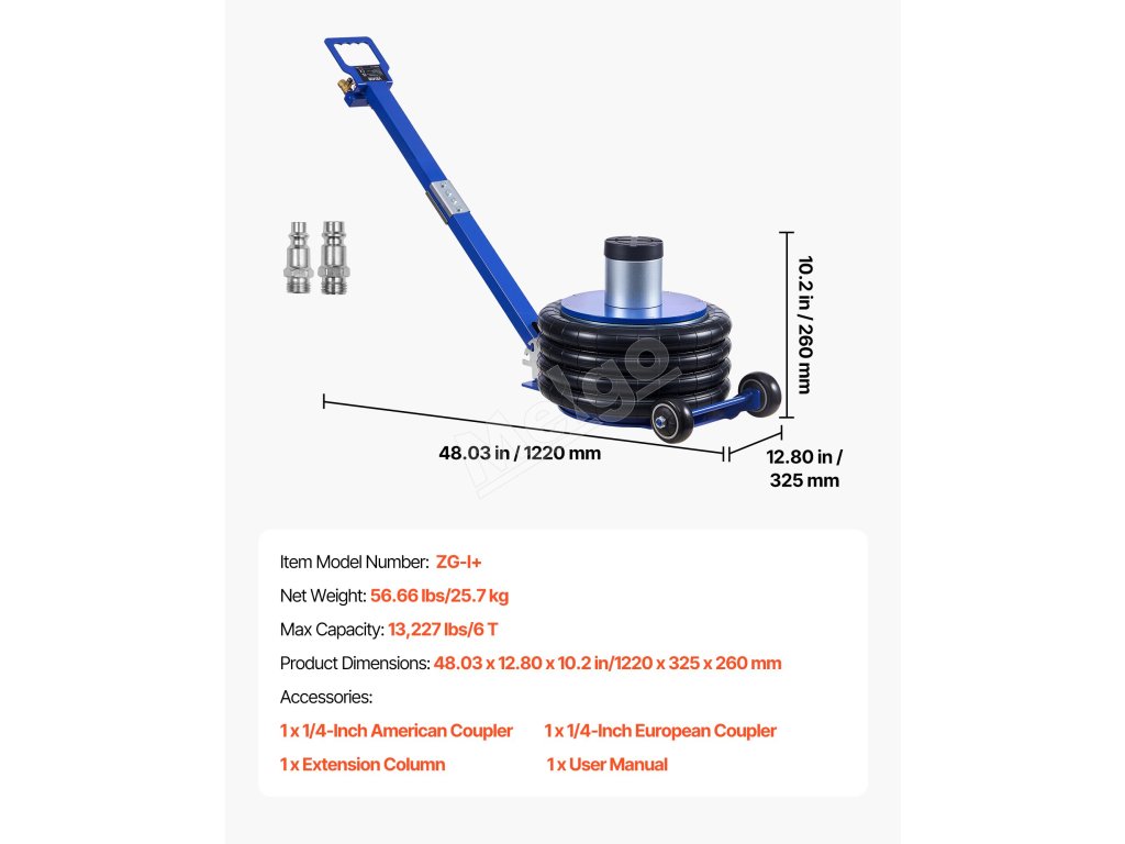 Vzduchový zdvihák 6 t, 673 mm, 4-vakový, nast. rukoväť, zdvih 2–5 s