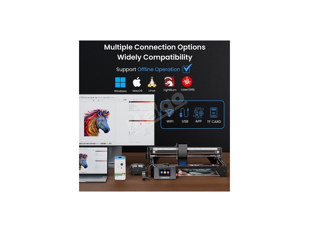 Vďaka 3,5-palcovému zabudovanému dotykovému displeju na prevádzku offline podporuje viacero spôsobov prenosu údajov (WiFi, kábel USB, APP, karta TF). Jeden počítač môže ovládať viacero zariadení, ktoré môžu pracovať paralelne, a je kompatibilný so systémami Windows/macOS/Linux, ako aj s hlavným prúdom gravírovacieho softvéru, čím spĺňa potreby profesionálnych dielní a výroby na úrovni závodu.
