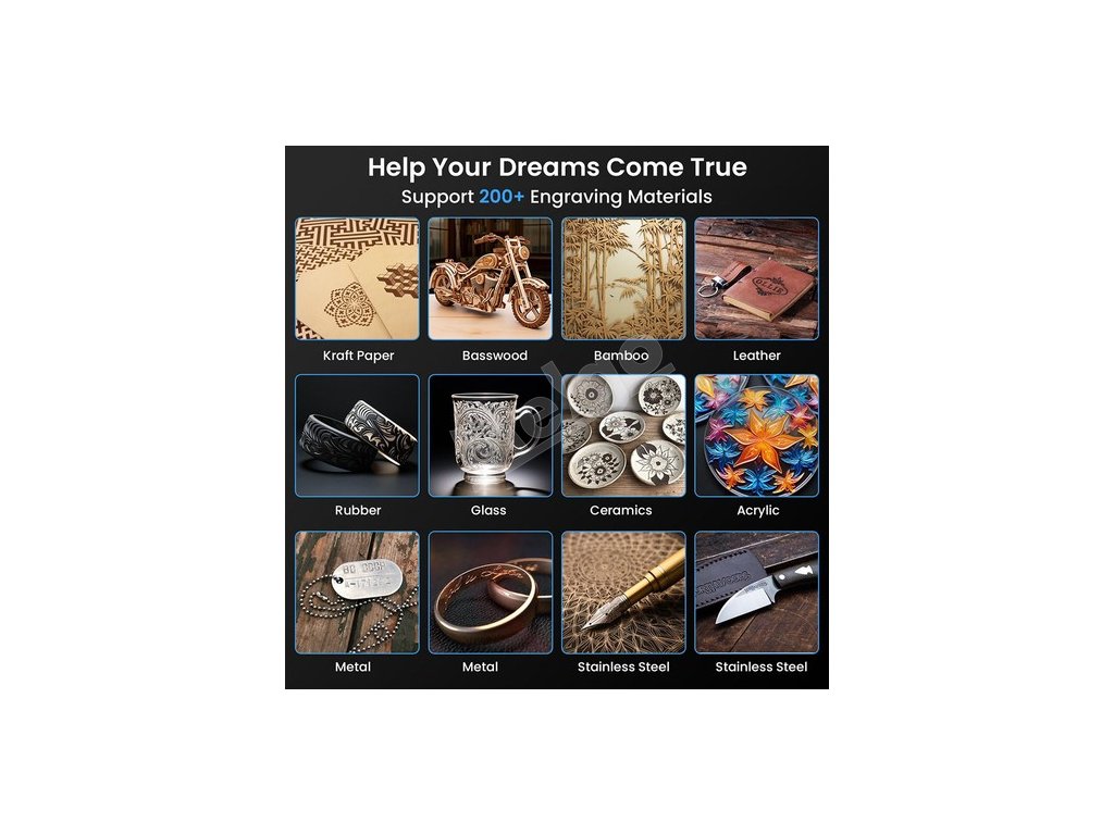 Vybavený pokročilou technológiou vylepšenia lasera 405mm², ktorá zabezpečuje tenšie vyryté línie, jasnejšie textúry a jemnejšie umelecké diela. V spojení s 32-bitovou čipovou súpravou ESP32 (pracujúcou na frekvencii 240 MHz) dosahuje rýchlosť gravírovania až 24 000 mm/min, čím dokonale vyvažuje presnosť a účinnosť.