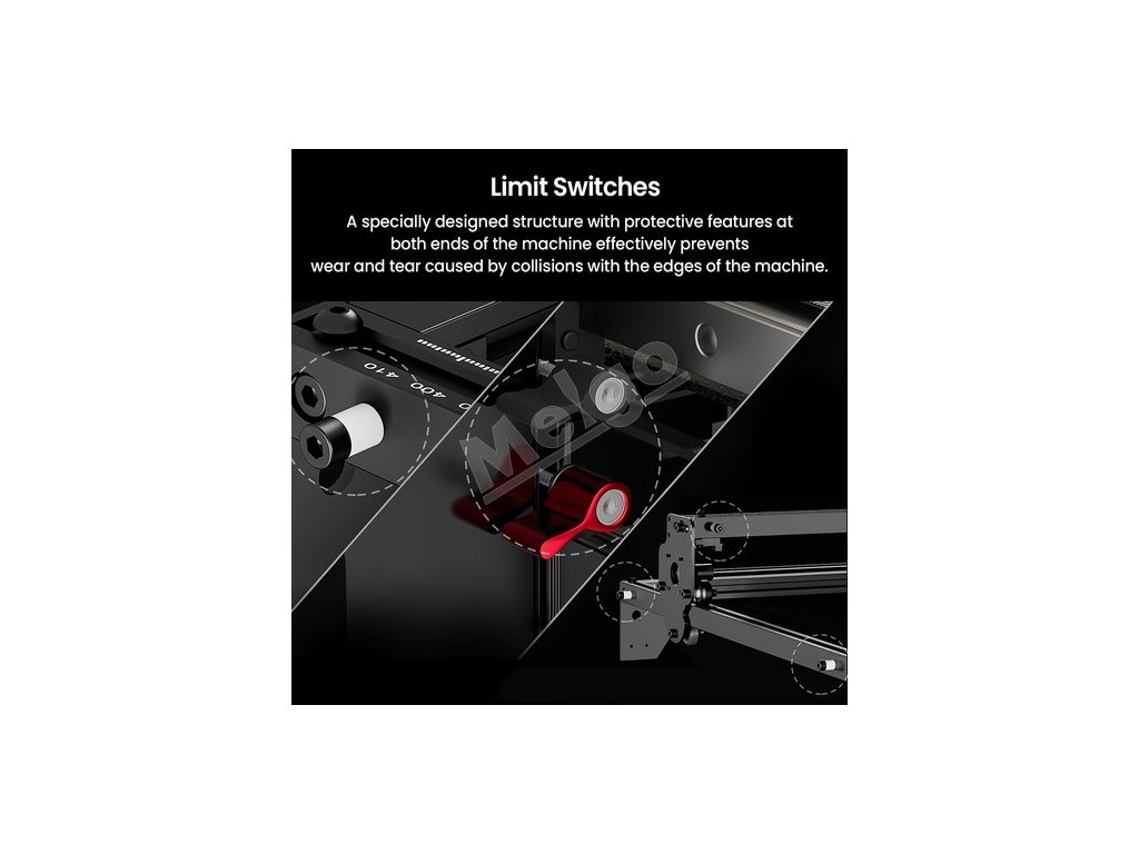 Je vybavený koncovými spínačmi osi XY a 5 bezpečnostnými ochranami (detekcia náklonu, detekcia plameňa, detekcia prerušenia dátového pripojenia, detekcia zamrznutia laserovej hlavy na viac ako 15 sekúnd a panoramatické filtračné sklo). Pri zistení abnormality sa automaticky vypne a vráti do nulového stavu, čím účinne chráni zariadenie aj obsluhu.