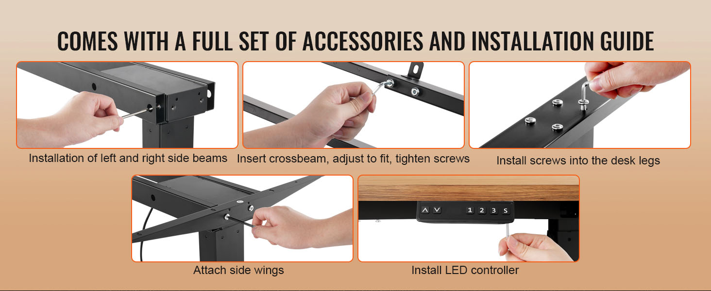 Tento stojaci pracovný stôl sa dodáva s kompletnou sadou príslušenstva a prehľadným, ľahko zrozumiteľným sprievodcom inštaláciou. Pri nerovných povrchoch je možné nastaviť podložky pod nohy, aby sa zabezpečila rovnováha.