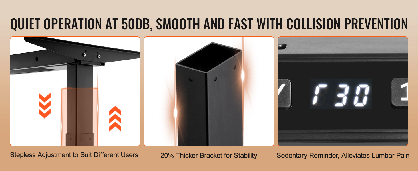 Tento stôl s hlučnosťou pod 50 decibelov počas nastavovania výšky funguje hladko a rýchlo, pričom antikolizná konštrukcia zaručuje väčšiu bezpečnosť. Jeho plynulé nastavenie výšky vyhovuje rôznym potrebám používateľov, zatiaľ čo zosilnené spodné tyče zaisťujú stabilitu a zabraňujú otrasom.
