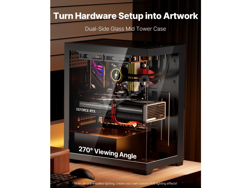 Táto PC skriňa, vyrobená z kvalitnej ocele SPCC a dvojitých panelov z tvrdeného skla, je kompatibilná so základnými doskami ATX. Dodáva sa s 2 x 120 mm ventilátormi a podporuje až 4 x 120 mm alebo 140 mm ventilátory, čím zabezpečuje výkonné chladenie. Podporuje až 3 pevné disky (2 x 2,5-palcový SSD a 1 x 3,5-palcový HDD).