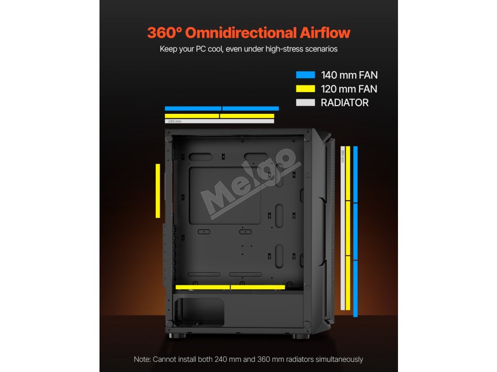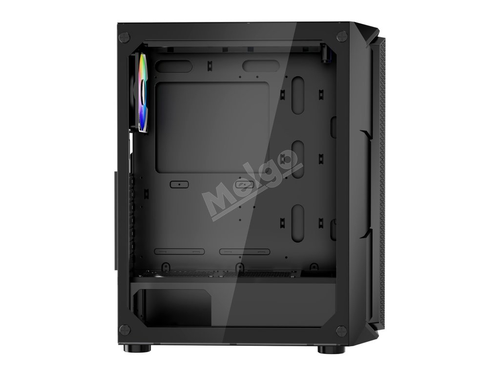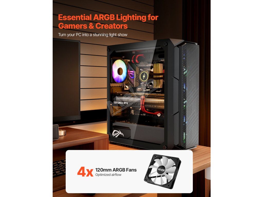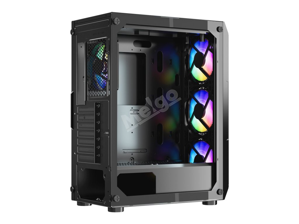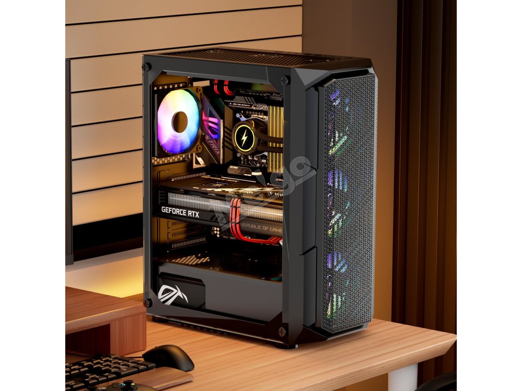 Táto skrinka je vybavená 4 x 120 mm ventilátormi ARGB, ktoré zaisťujú vynikajúci chladiaci výkon a zároveň vytvárajú pohlcujúcu hernú atmosféru so živými svetelnými efektmi. Je vyrobená z ocele SPCC a tvrdeného skla, je kompatibilná so základnými doskami ATX a podporuje až 4 pevné disky.