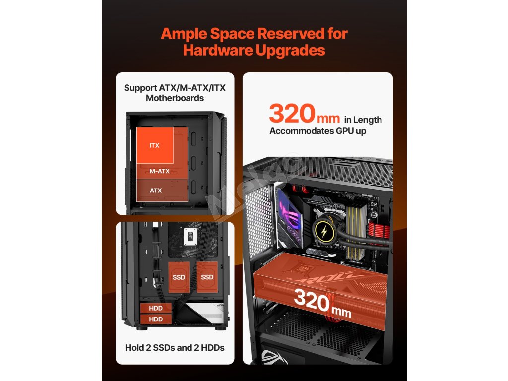 Pc skrinka mid-tower, temperované sklo, 4×120 mm argb, gpu do 320 mm