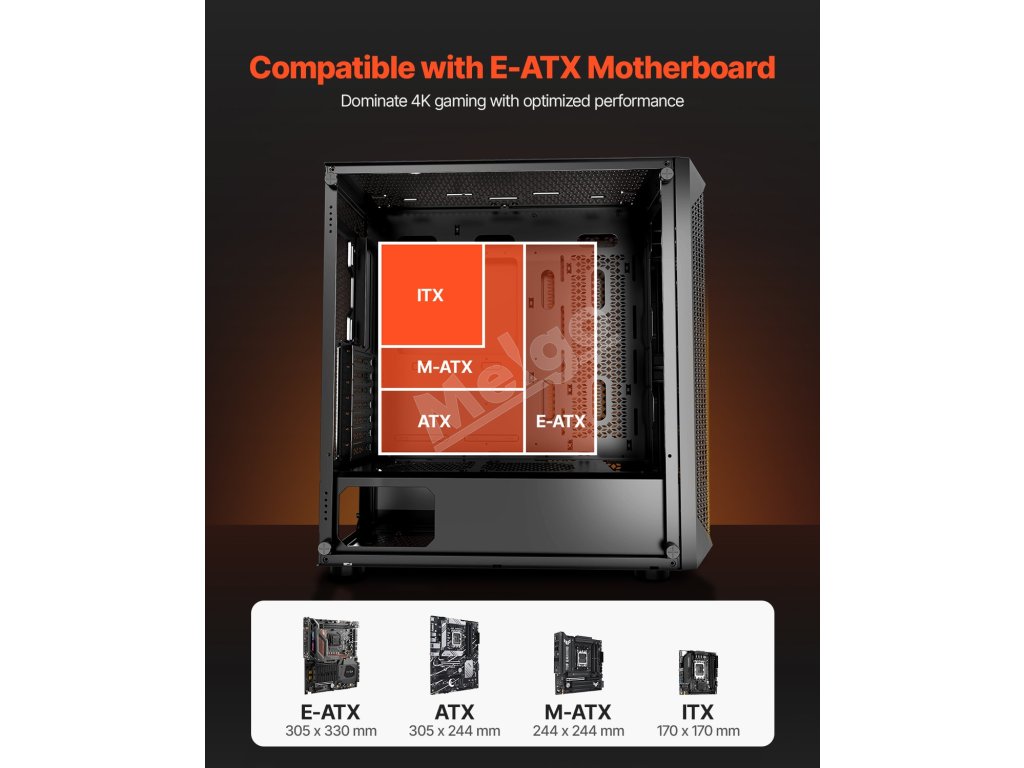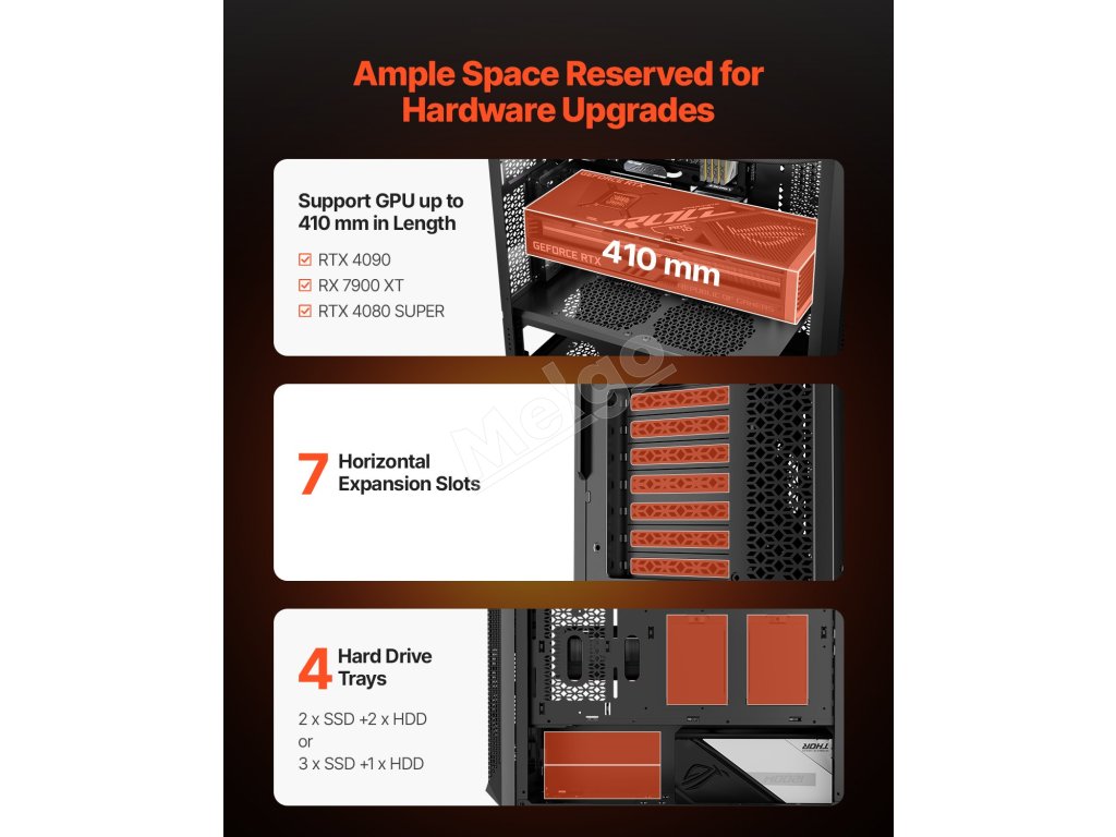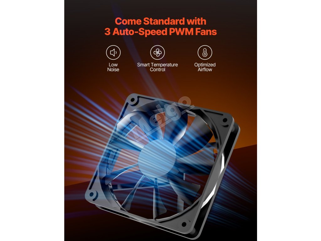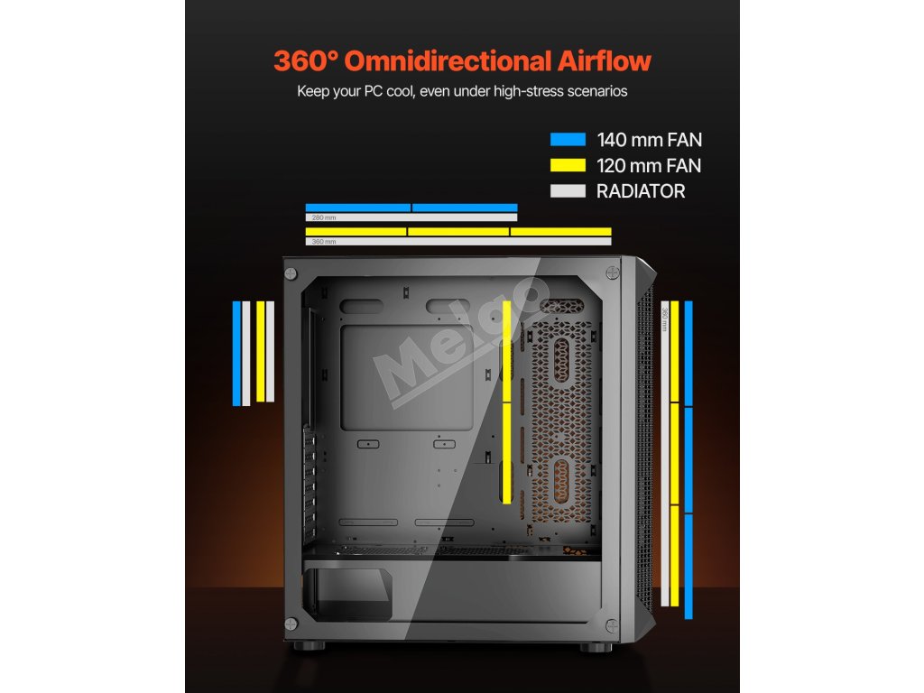 Táto skriňa je kompatibilná s profesionálnejšími základnými doskami E-ATX. Dodáva sa s 3 x 140 mm ventilátormi PWM a podporuje až 9 x 120 mm ventilátorov alebo 6 x 140 mm ventilátorov + 2 x 120 mm ventilátory, čo zaručuje optimálny chladiaci výkon. S priestorom až pre 4 pevné disky (3 x SSD + 1 x HDD alebo 2 x SSD + 2 x HDD).