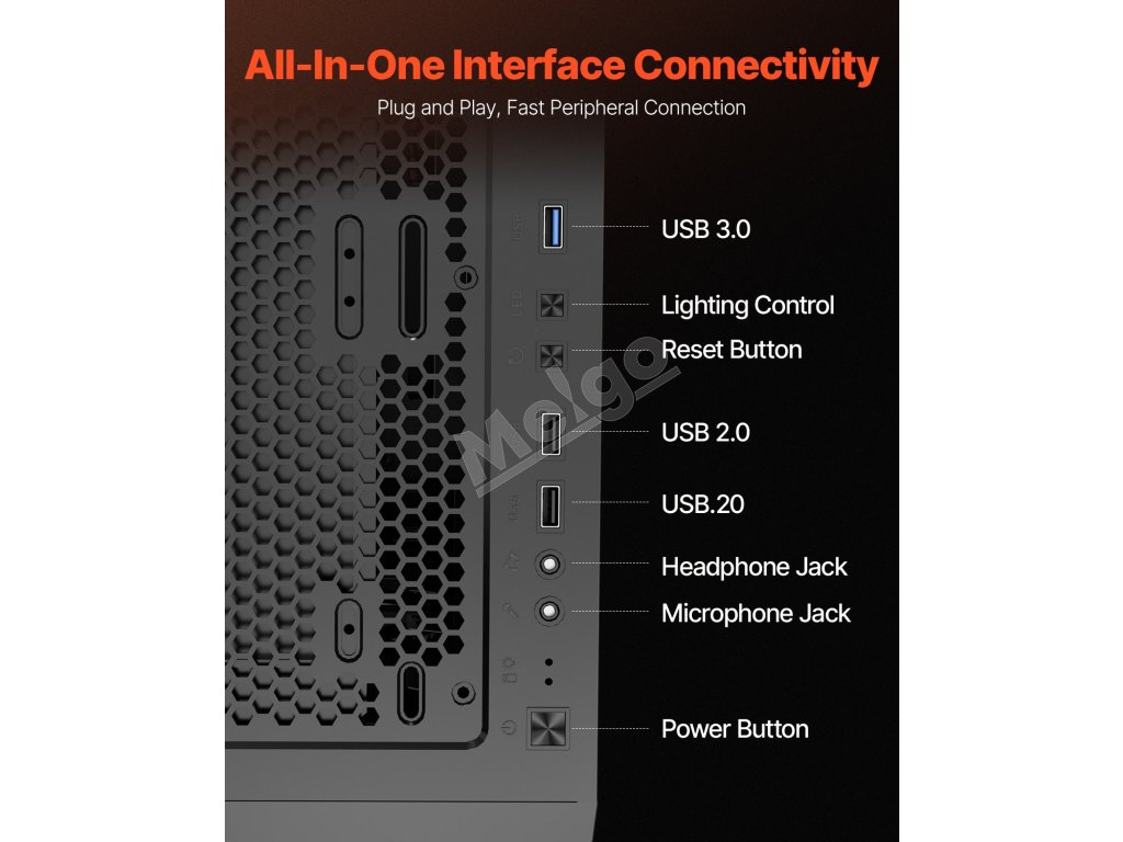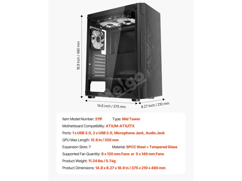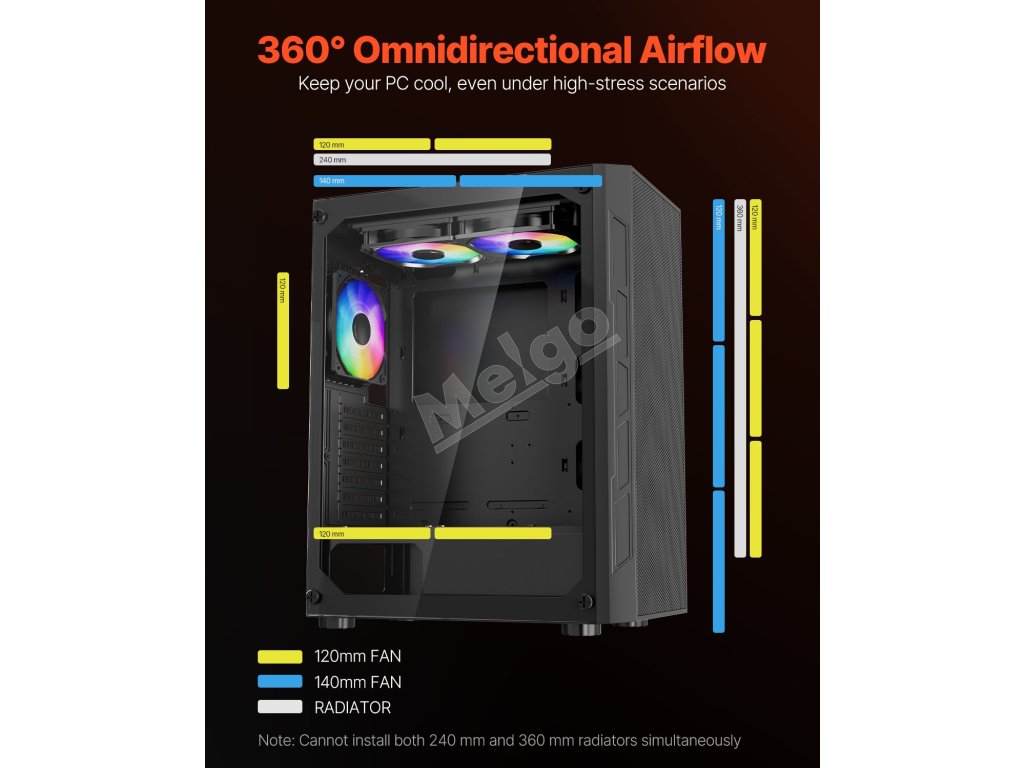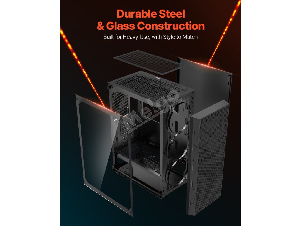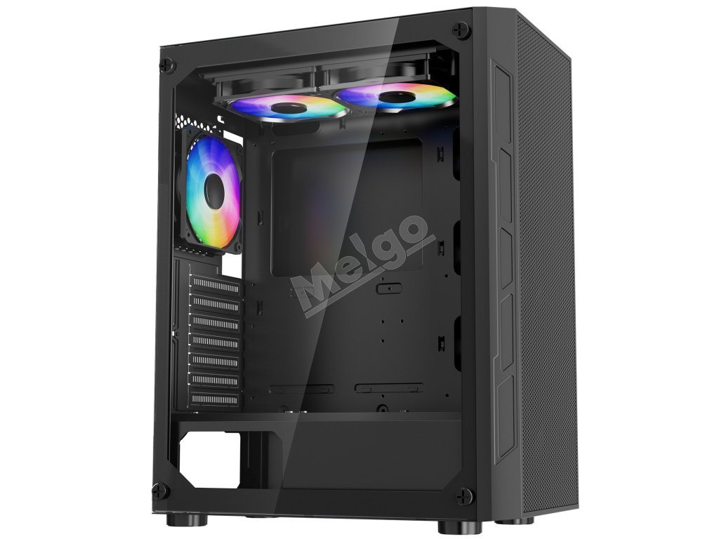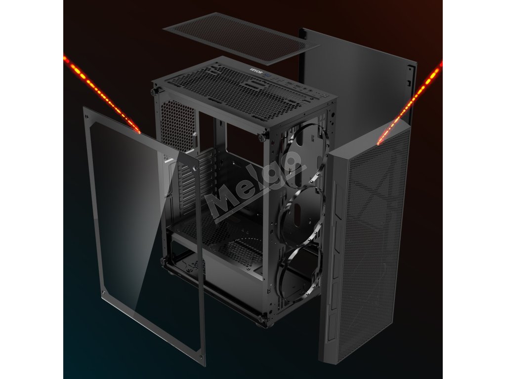 Táto skrinka je vybavená 3 x 120 mm ventilátormi ARGB, ktoré zaisťujú vynikajúci chladiaci výkon a zároveň vytvárajú pohlcujúcu hernú atmosféru so živými svetelnými efektmi. Je vyrobená z ocele SPCC a tvrdeného skla, je kompatibilná so základnými doskami ATX a podporuje až 4 pevné disky.