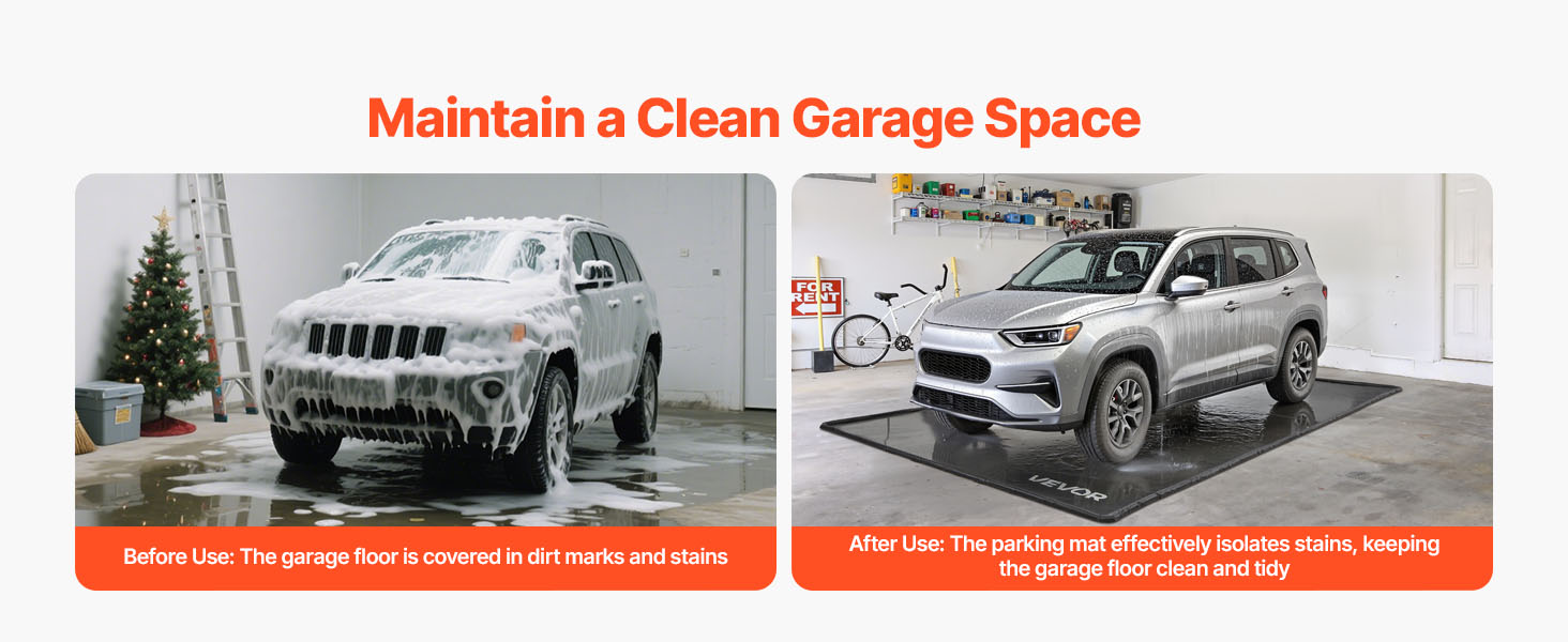 Pred použitím rohože na zadržiavanie tekutín v garáži bola podlaha garáže pokrytá stopami po špine a škvrnami. Po použití rohož účinne izoluje škvrny a udržiava podlahu garáže čistú a upratanú. Vodotesnosť a odolnosť voči škvrnám pomáhajú udržiavať garáž trvalo čistú.