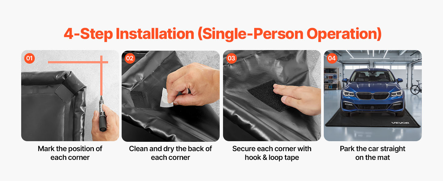 Garážová rohož do auta má konštrukciu s páskou na háčik a slučku, vďaka ktorej je proces inštalácie jednoduchý a rýchly. Môže ju ľahko nainštalovať jedna osoba bez potreby zložitého náradia alebo pomoci. Rieši nepríjemnosti používateľov pri inštalácii parkovacích rohoží.