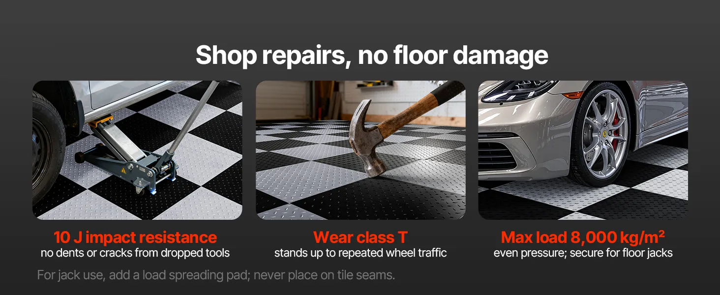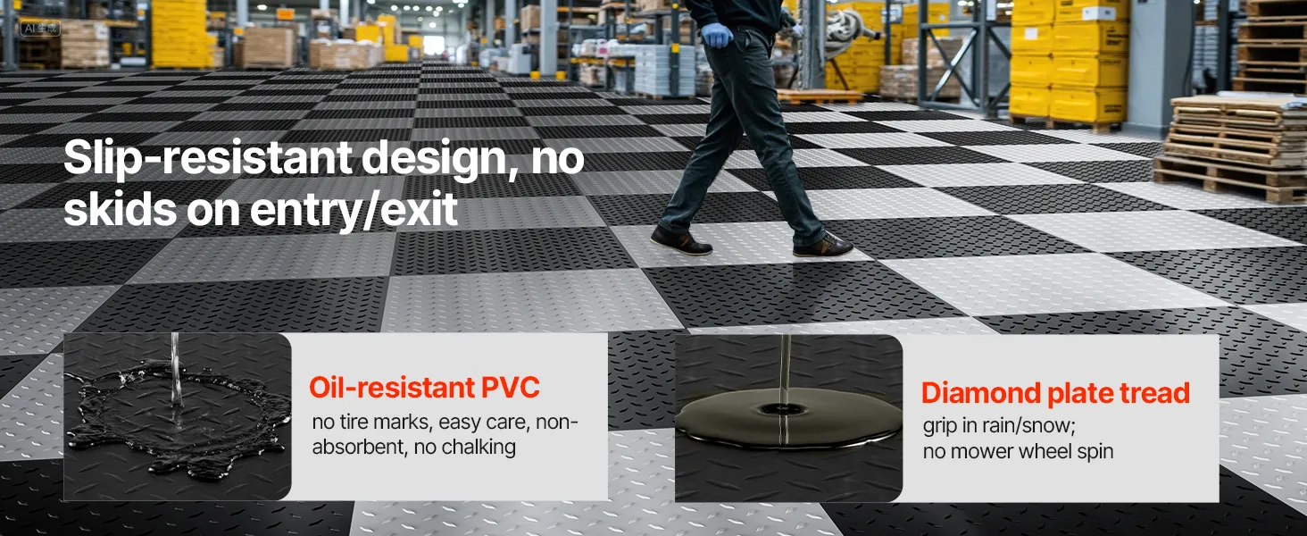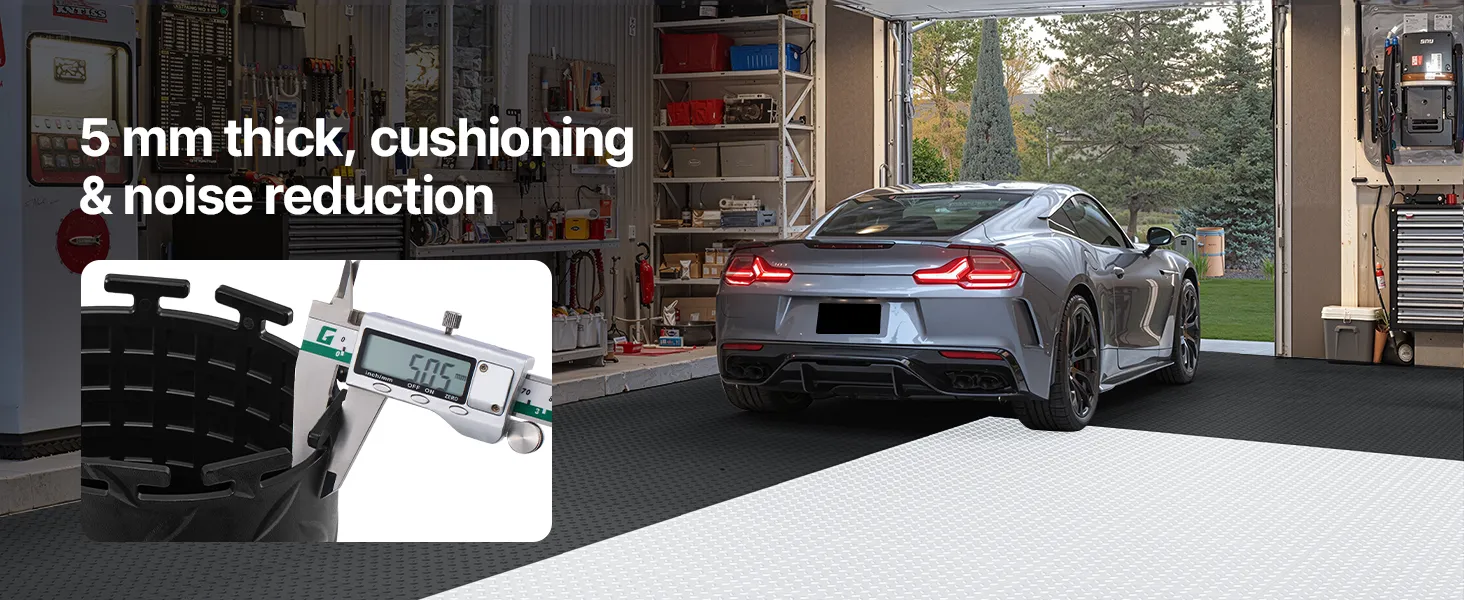 ODPOVEĎ: PVC. Vysoká tvrdosť, protišmyková, odolná voči olejom; žiadne otlaky, poškodenia alebo deformácie ani pri dlhšom parkovaní nákladných vozidiel a SUV.