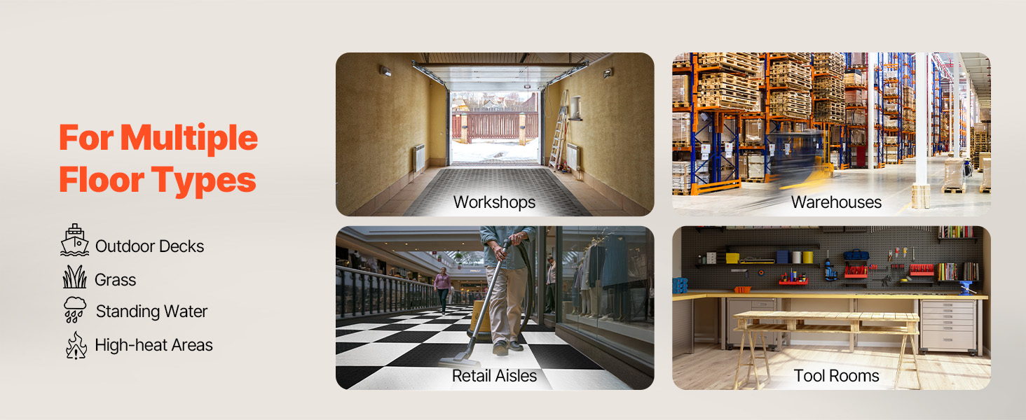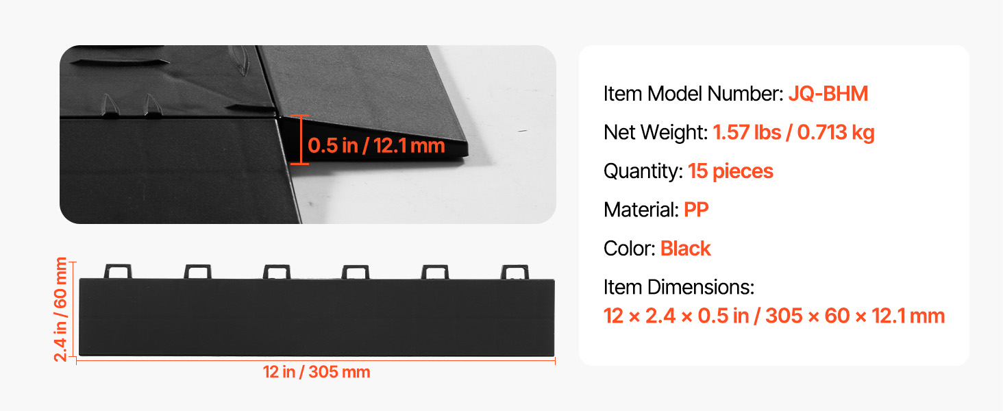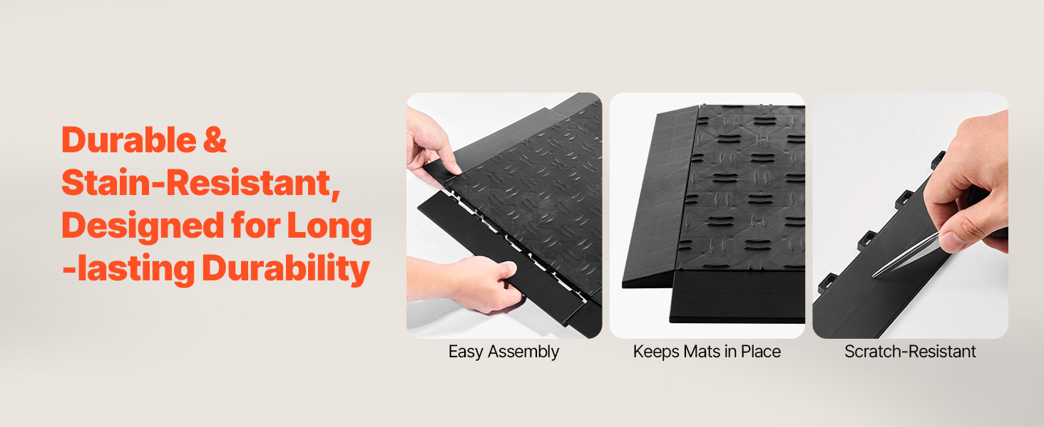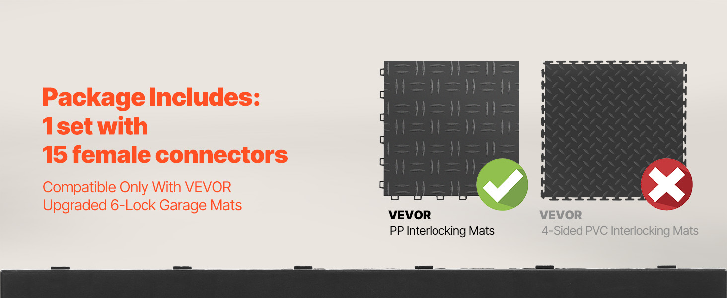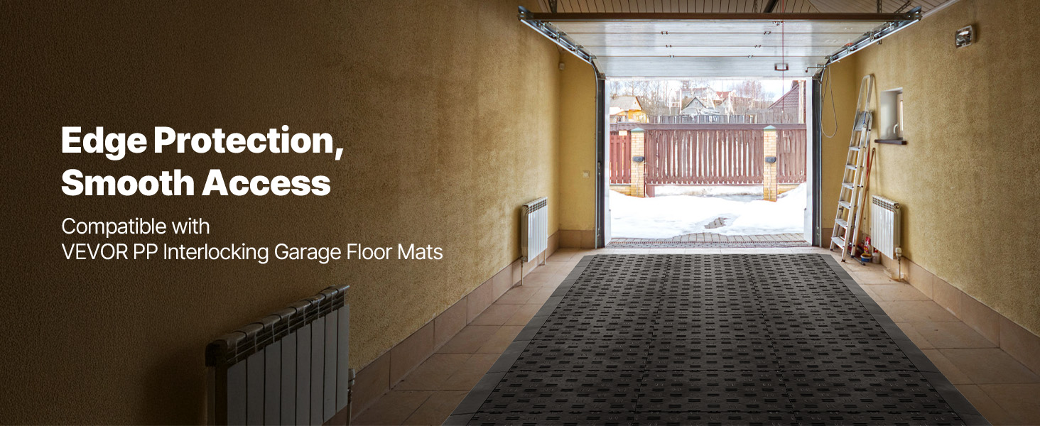 Kompatibilné so štvorstrannými zámkovými podlahovými rohožami VEVOR z PVC. Jedna súprava chráničov hrán poskytuje úplné pokrytie pre 8-dielne PVC 4-stranné prepojovacie garážové rohože.