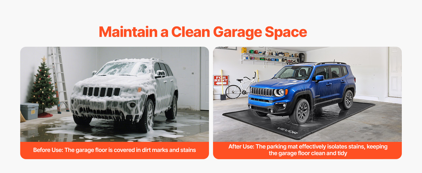 Pred použitím rohože na zadržiavanie tekutín v garáži bola podlaha garáže pokrytá stopami po špine a škvrnami. Po použití rohož účinne izoluje škvrny a udržiava podlahu garáže čistú a upratanú. Vodotesnosť a odolnosť voči škvrnám pomáhajú udržiavať garáž trvalo čistú.