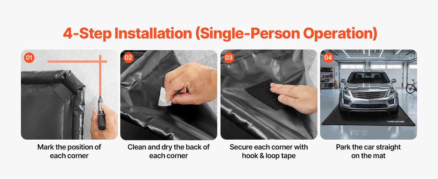 Garážová rohož do auta má konštrukciu s páskou na háčik a slučku, vďaka ktorej je proces inštalácie jednoduchý a rýchly. Môže ju ľahko nainštalovať jedna osoba bez potreby zložitého náradia alebo pomoci. Rieši nepríjemnosti používateľov pri inštalácii parkovacích rohoží.
