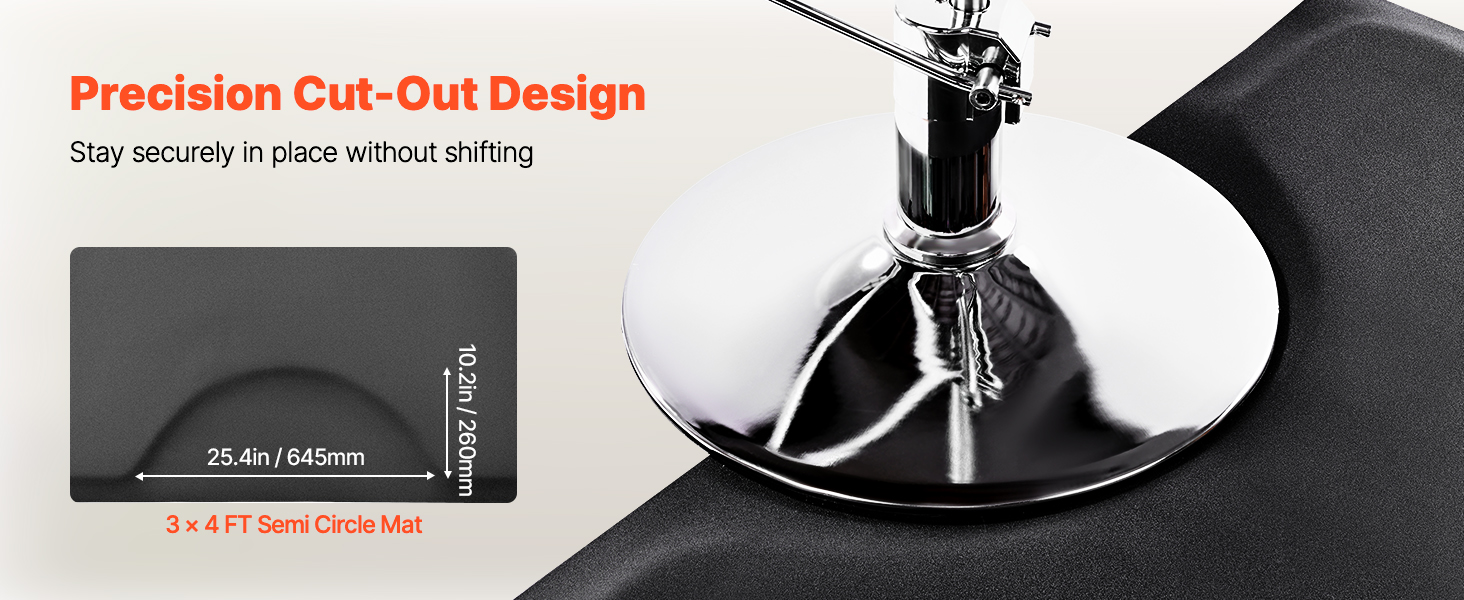 Naša polkruhová podložka pod stoličku v salóne s rozmermi 1220 x 905 mm ponúka priestrannú plochu na státie, ktorá holičom umožňuje pracovať voľne a pohodlne. A výrez s rozmermi 645 x 260 mm (25,4 x 10,2 palca) je vhodný pre väčšinu salónnych kresiel s okrúhlou základňou. (Pred objednaním zmerajte základňu stoličky, aby ste sa uistili, že sedí)
