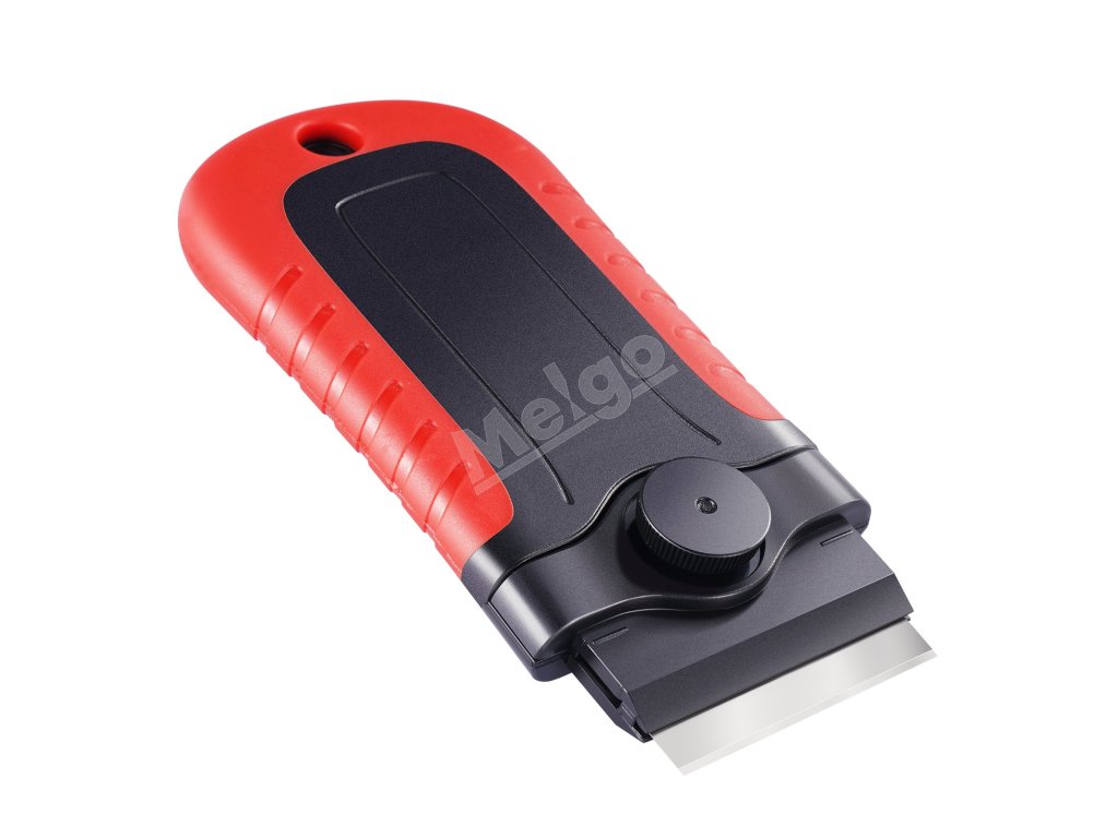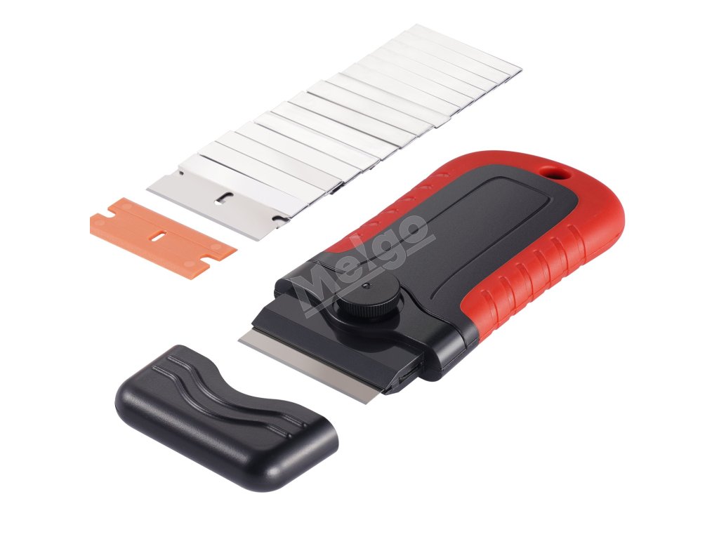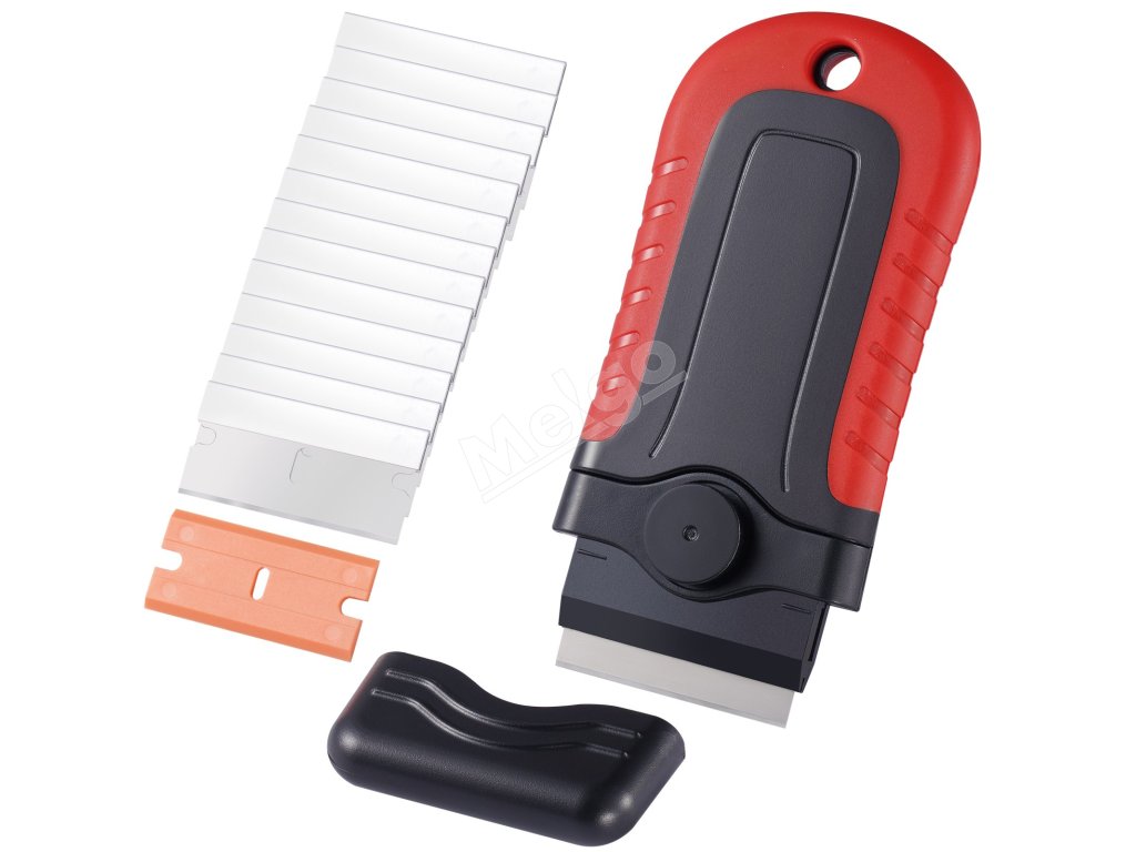 Škrabka na sklo s poistkou/krytom, 15 čepeľí, oceľ/pom, na nálepky