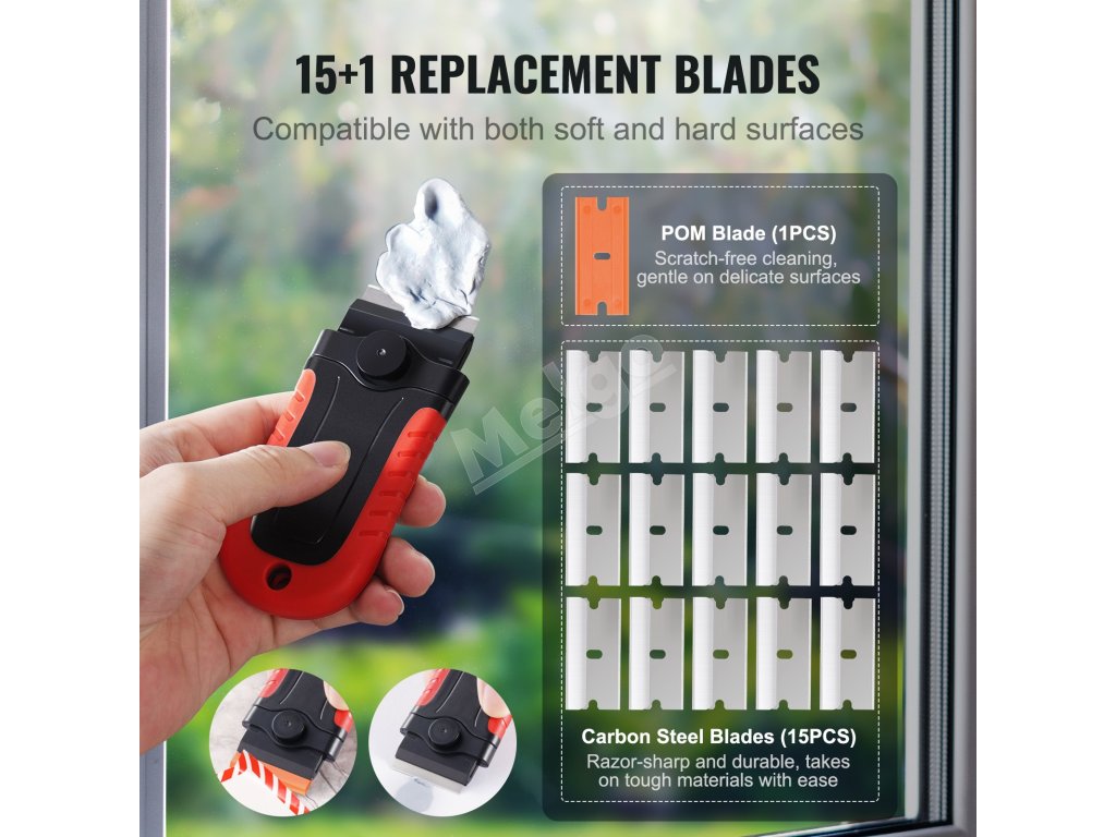 Naša škrabka na žiletky sa dodáva s 15 čepeľami z uhlíkovej ocele, ktoré sú vhodné na čistenie odolných, špinavých stôp a tvrdých povrchov. Navyše čepeľ POM je vhodná na čistenie nálepiek a povrchov bez povrchov na tvrdých a mäkkých povrchoch.