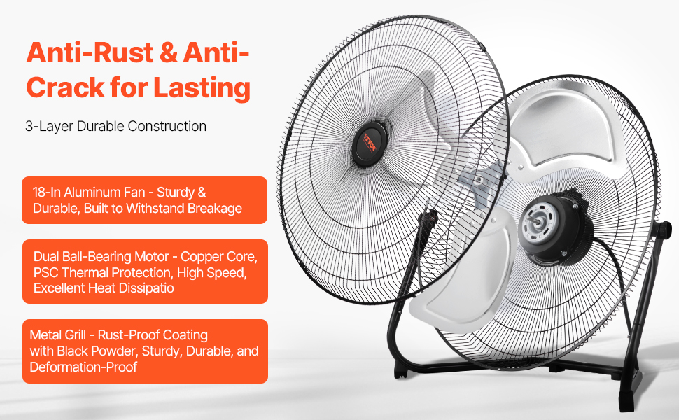 Tento priemyselný ventilátor pre náročnú prevádzku má kovovú mriežku s čiernym práškovým náterom, ktorý je odolný proti korózii a zaručuje dlhú životnosť. 18-palcové hliníkové lopatky sú pevné, odolné proti ohybu a vyrobené tak, aby vydržali. Vysoko kvalitný motor s dvojitým guľôčkovým ložiskom a tepelná ochrana PSC zaručujú bezpečné a spoľahlivé dlhodobé používanie.