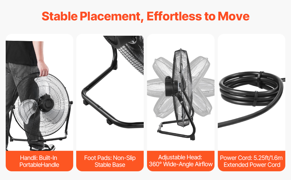 Náš nastaviteľný komerčný ventilátor je vybavený vstavanou rukoväťou pre ľahkú prenosnosť. Základňa je vybavená protišmykovými gumovými nožičkami pre extra stabilitu. Má tiež otočný mechanizmus pre vertikálne nastavenie v rozsahu 360°, ktorý zabezpečuje široký uhol prúdenia vzduchu. Predĺžený napájací kábel s dĺžkou 5,25 ft umožňuje flexibilné umiestnenie.