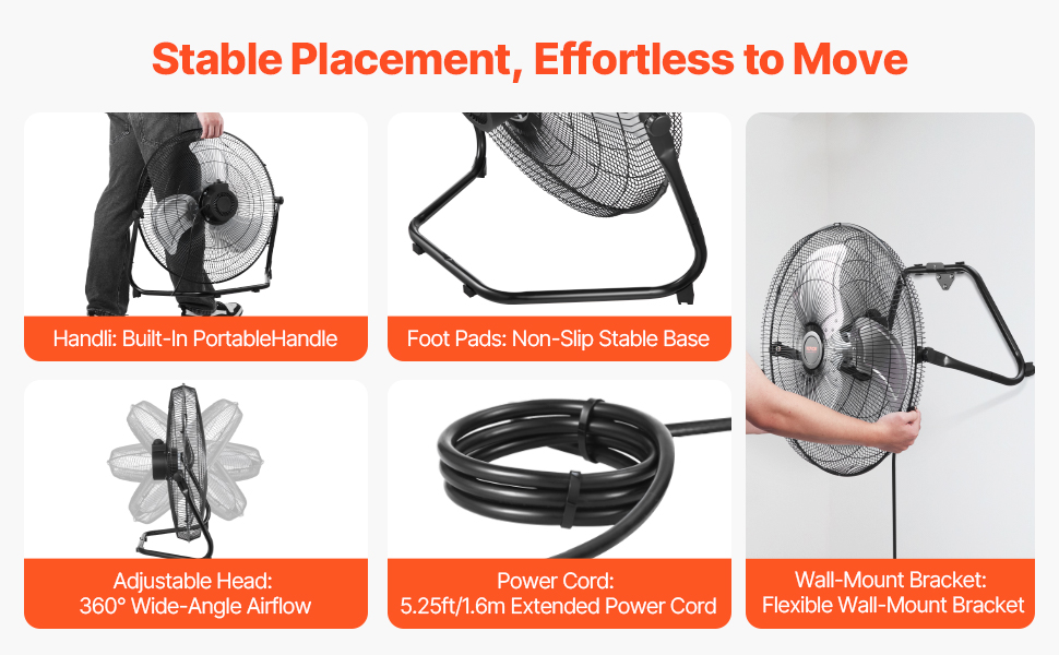 Náš nastaviteľný komerčný ventilátor obsahuje držiak na montáž na stenu na jednoduchú inštaláciu a zabudovanú rukoväť na prenášanie. Protišmykové gumové nožičky základne zabezpečujú stabilitu, zatiaľ čo otočný mechanizmus poskytuje 360° vertikálne prúdenie vzduchu. Predĺžený 5,25 ft napájací kábel ponúka flexibilné možnosti zapojenia.