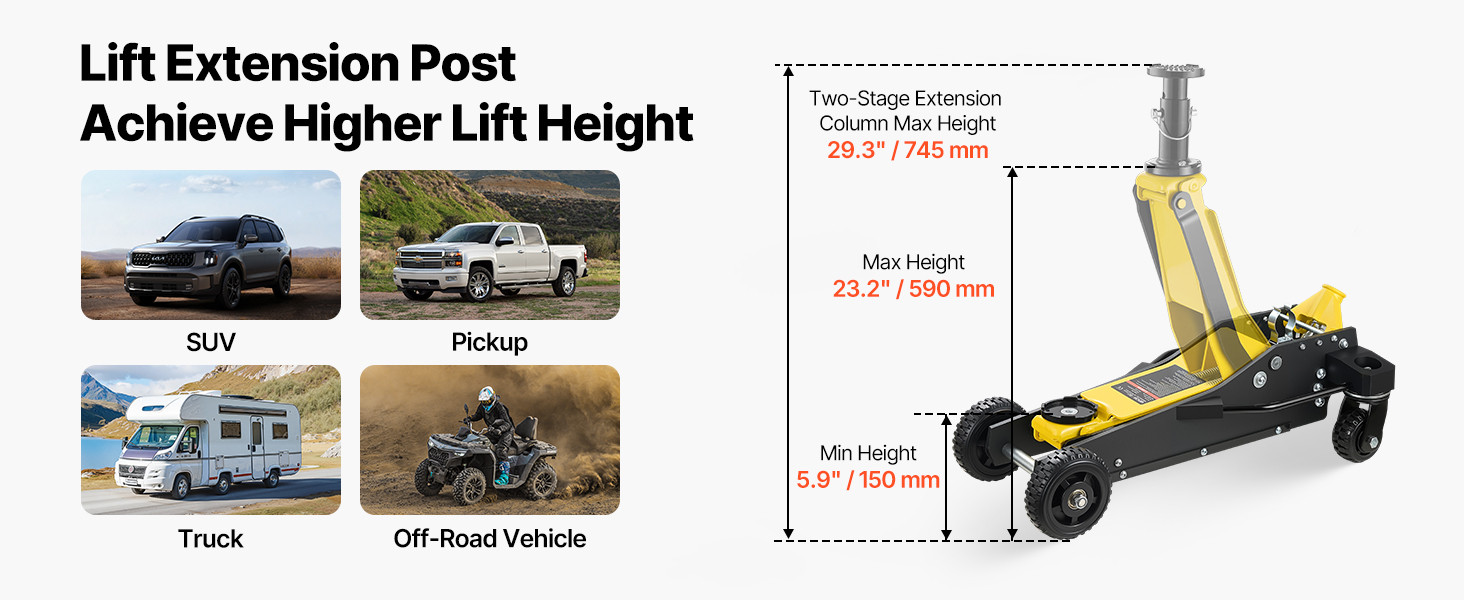 Náš podlahový zdvihák s vysokým zdvihom obsahuje dodatočnú predĺženú tyč na zdvíhanie vozidiel s vysokou svetlou výškou. Pridaná výška uľahčuje a spríjemňuje opravy a údržbu.