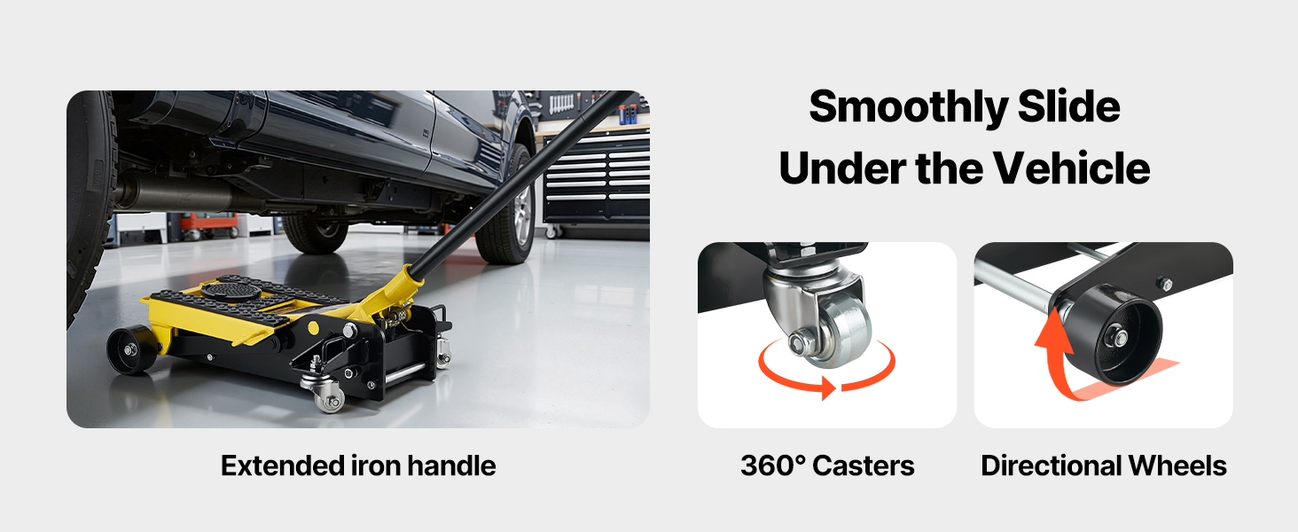 Tento nízkoprofilový zdvihák je vybavený otočnými kolieskami s rozsahom 360° a smerovými kolieskami pre plynulý pohyb. Ľahko sa valí po betóne v garáži alebo po asfalte vonku. Umiestnenie pod vozidlo vyžaduje menej námahy.