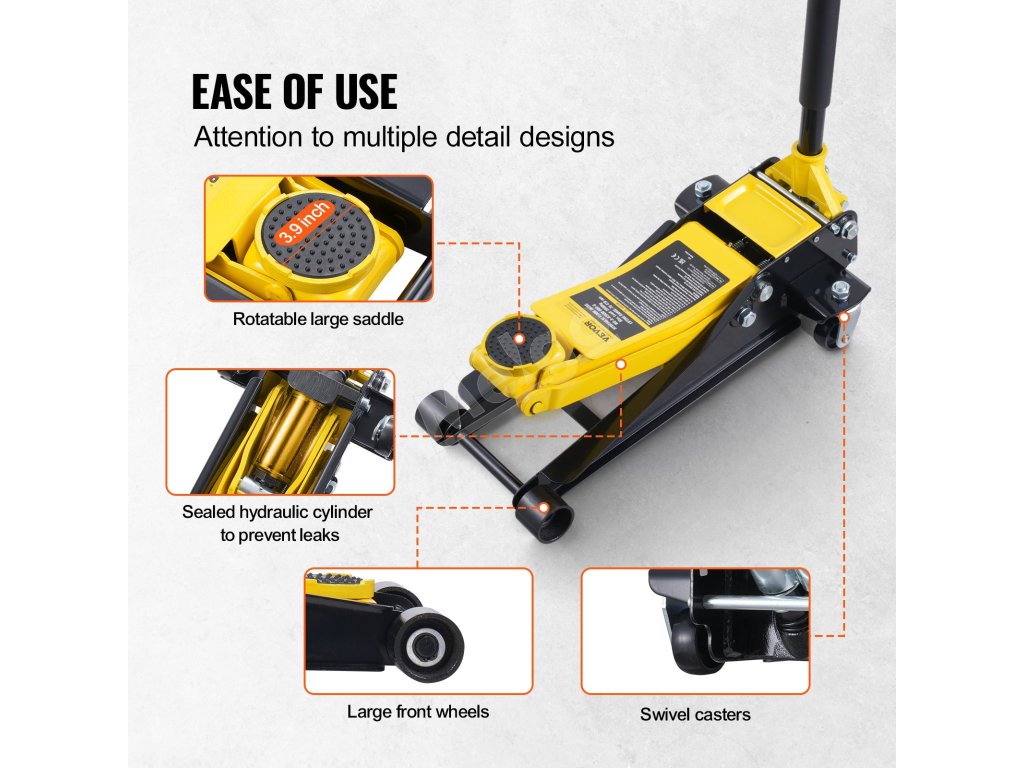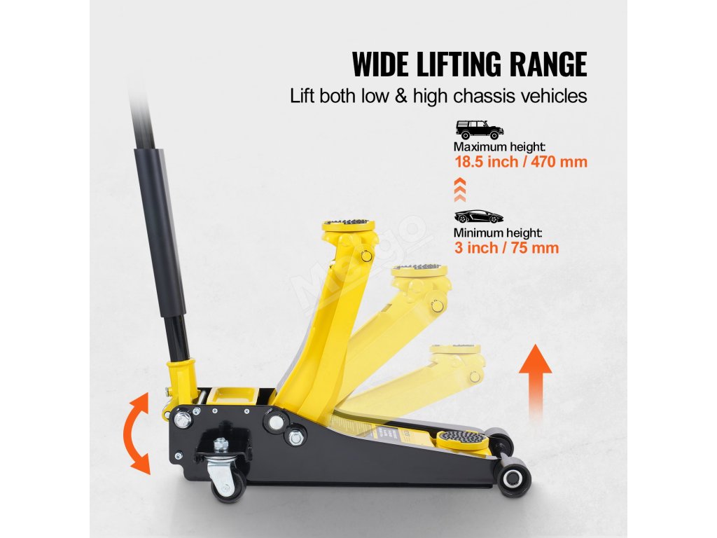 Podlahový hydraulický zdvihák dokáže zdvihnúť vozidlá s hmotnosťou až 2 TON, takže je vhodný pre bežne používané sedany a SUV, čím zjednodušuje práce na opravách automobilov s menším stresom.