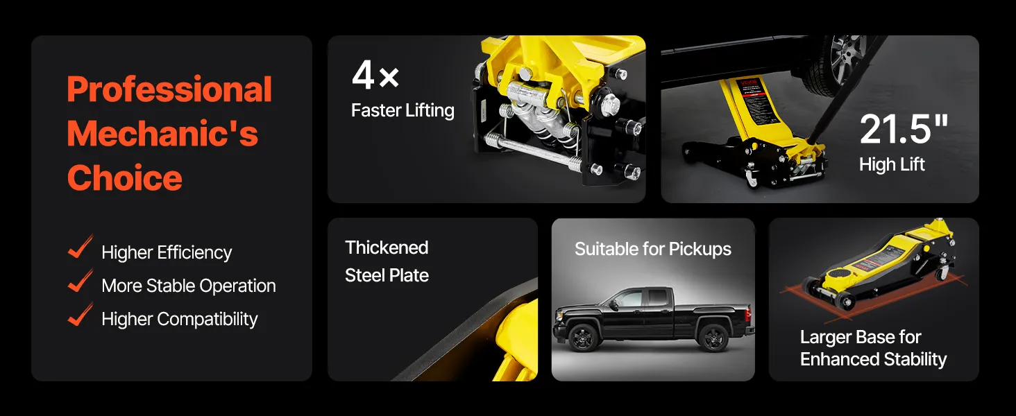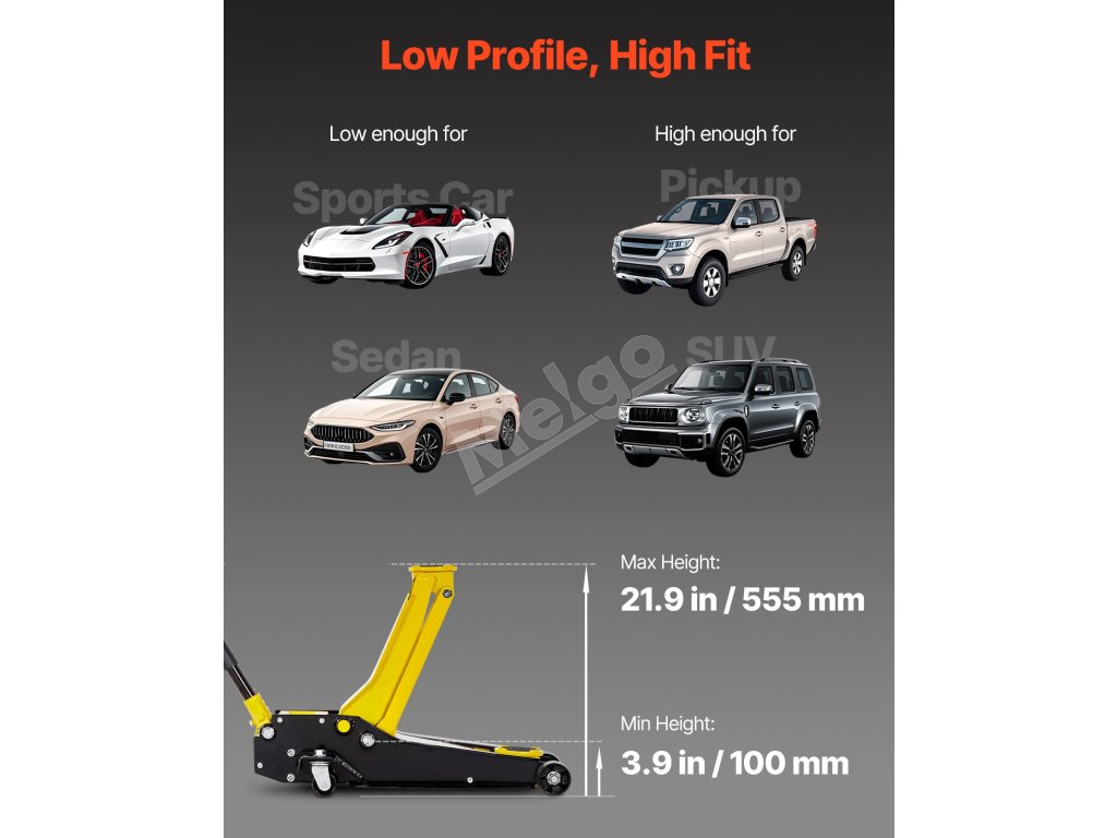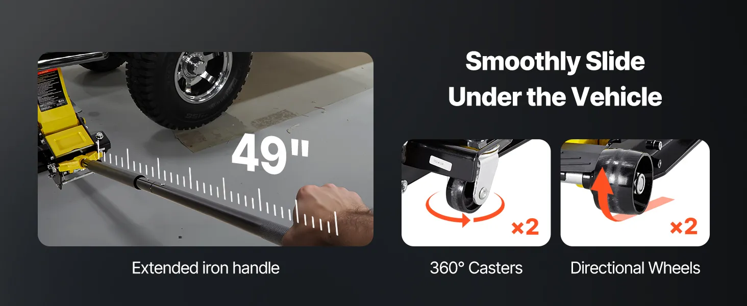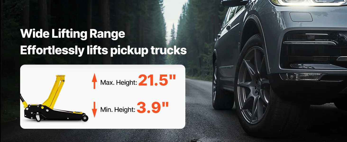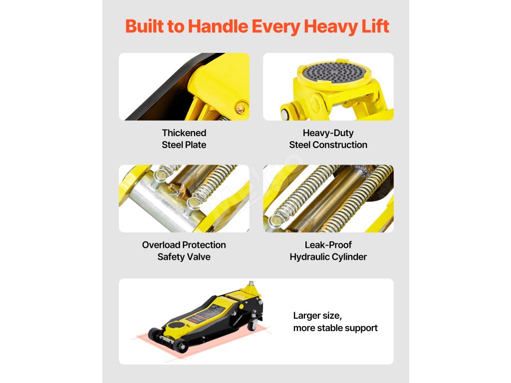 Tento vysokozdvižný železný podlahový zdvihák poskytuje silnú nosnosť na jednoduché zdvíhanie sedanov, SUV a pickupov. Jeho predĺžená výška zdvihu umožňuje pohodlnejšiu údržbu pickupov, výmenu pneumatík a čistenie. Poznámka: Pri dlhodobých opravách vždy používajte stojan na zdvihák.