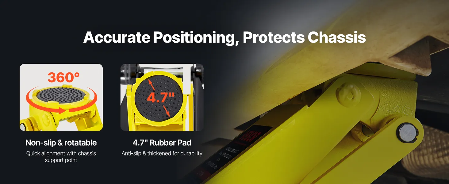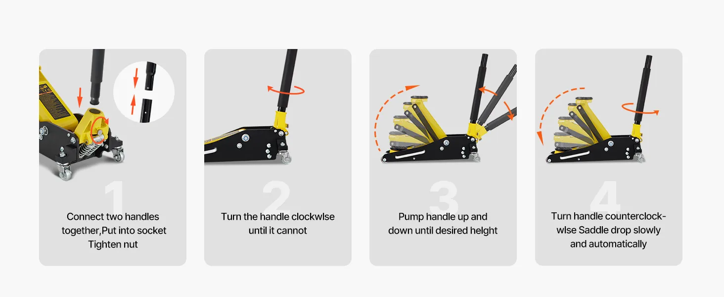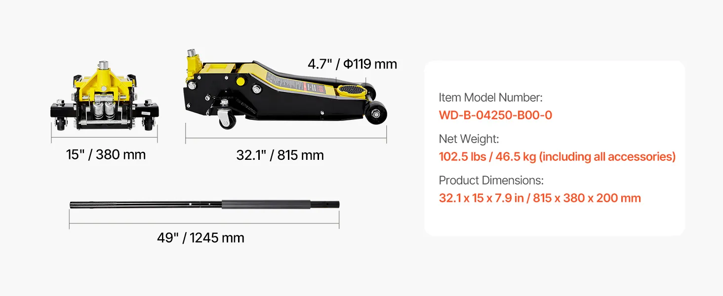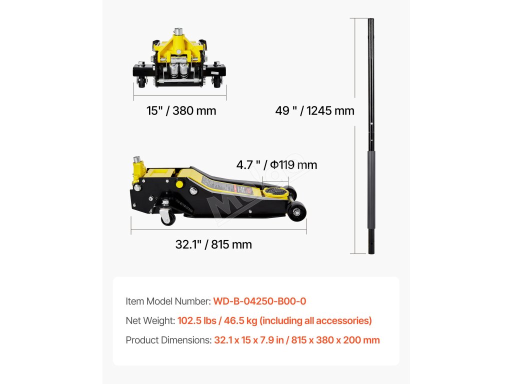 Tento vysokozdvižný železný podlahový zdvihák poskytuje silnú nosnosť na jednoduché zdvíhanie sedanov, SUV a pickupov. Jeho predĺžená výška zdvihu umožňuje pohodlnejšiu údržbu pickupov, výmenu pneumatík a čistenie. Poznámka: Pri dlhodobých opravách vždy používajte stojan na zdvihák.