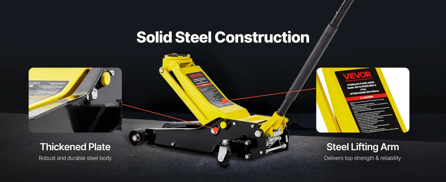 Tento nízkoprofilový podlahový zdvihák je vyrobený zo zosilnenej ocele pre dlhodobú životnosť a odolnosť voči poškodeniu.