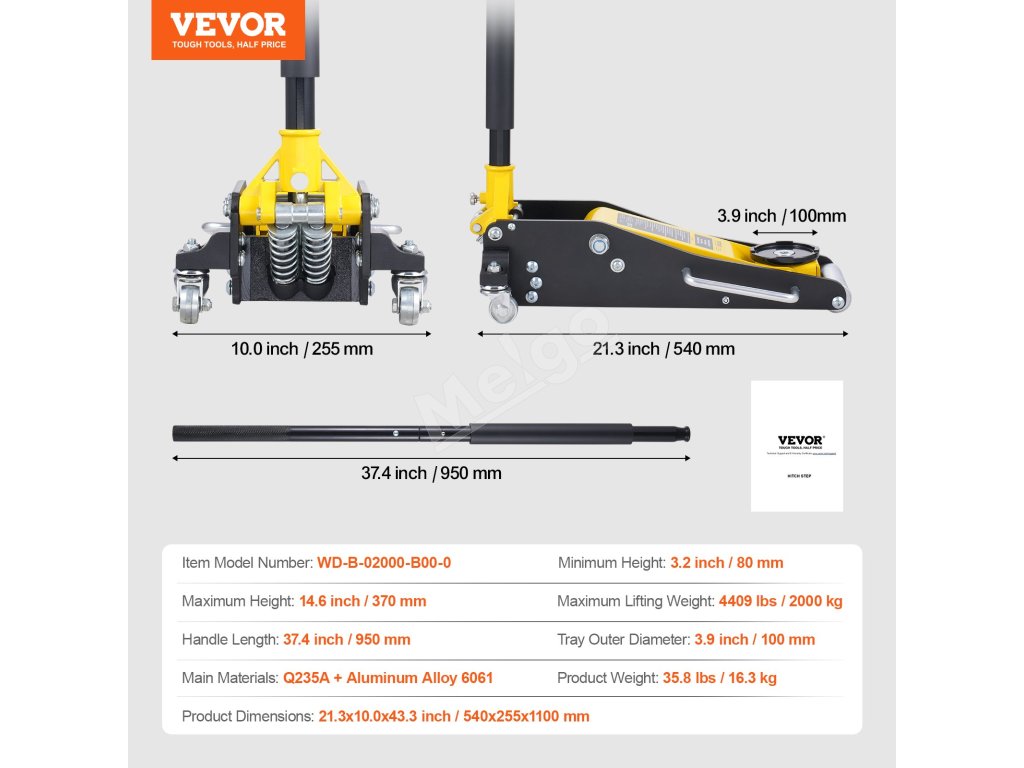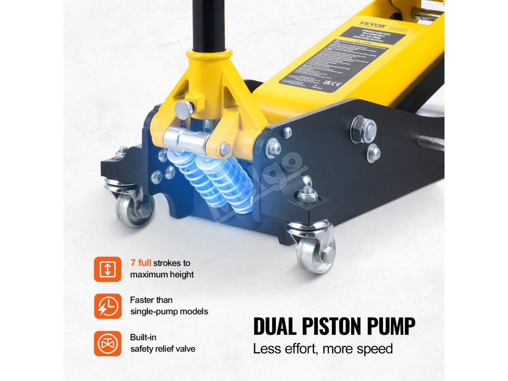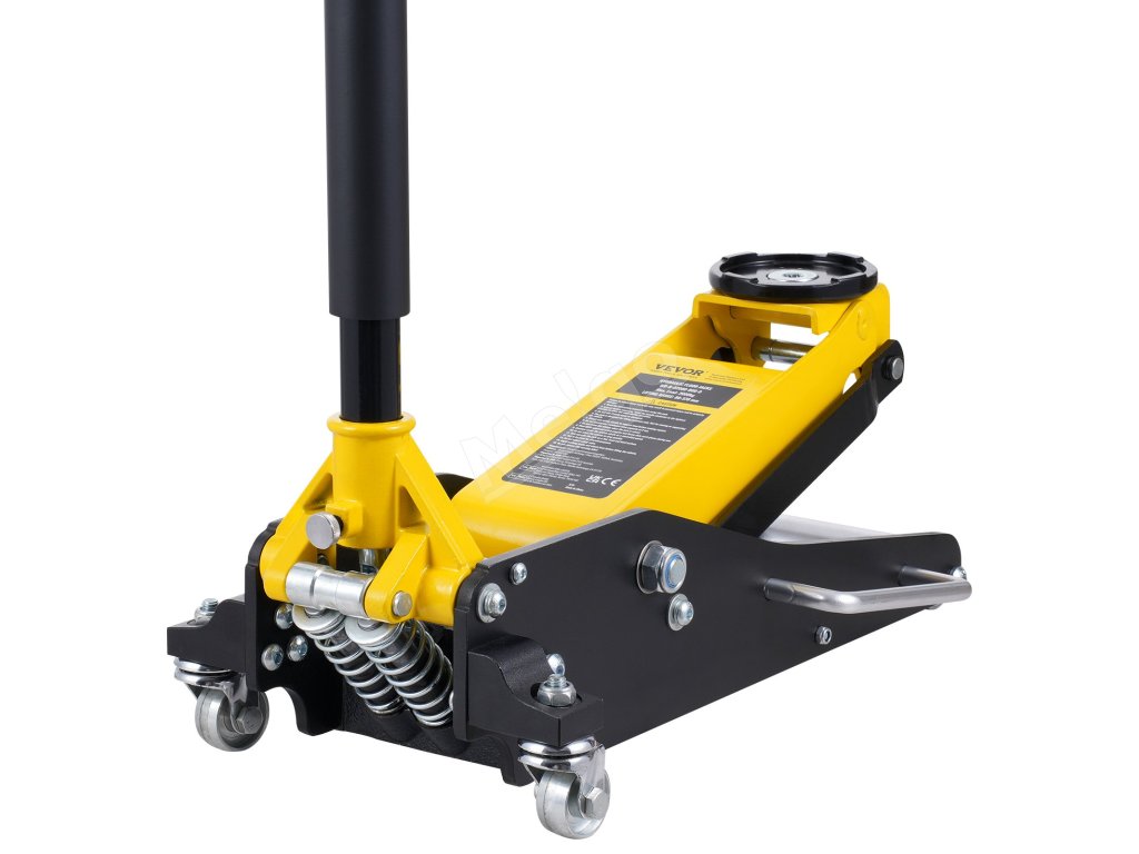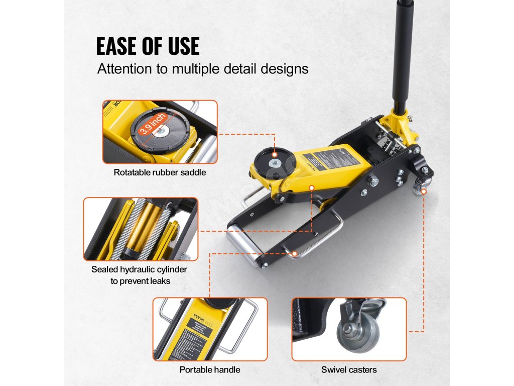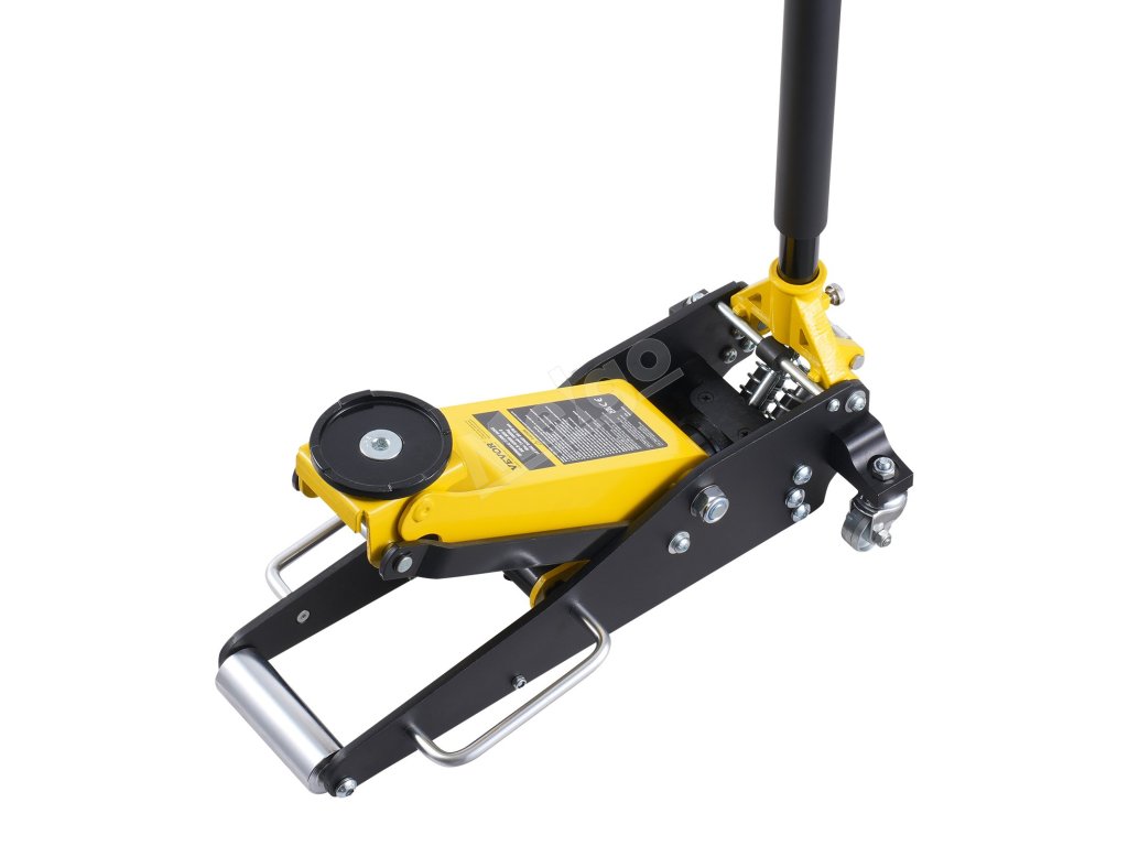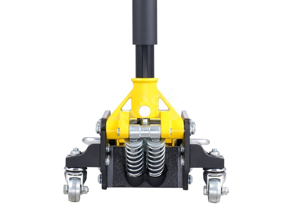 Vybavený veľkým gumovým sedlom, ktoré pomáha chrániť vaše vozidlo; dvojité bočné rukoväte a otočné kolieska umožňujú rýchly a jednoduchý presun a prepravu zdviháka; rukoväť je odnímateľná.