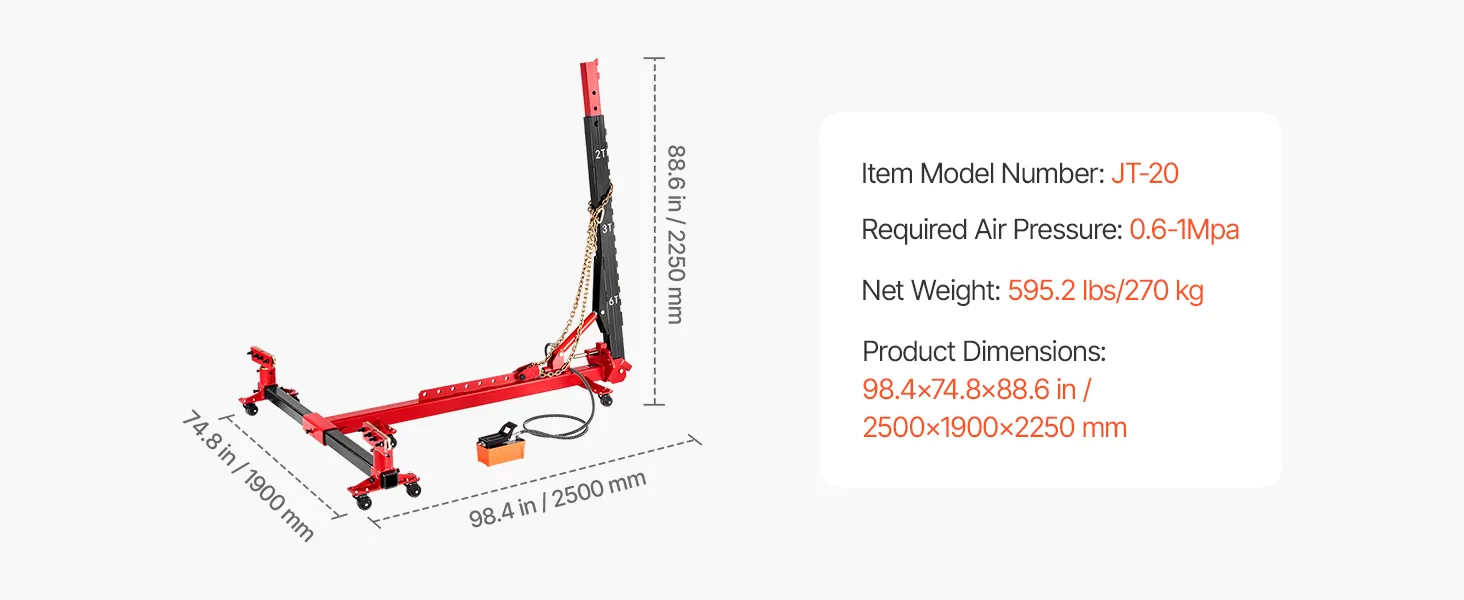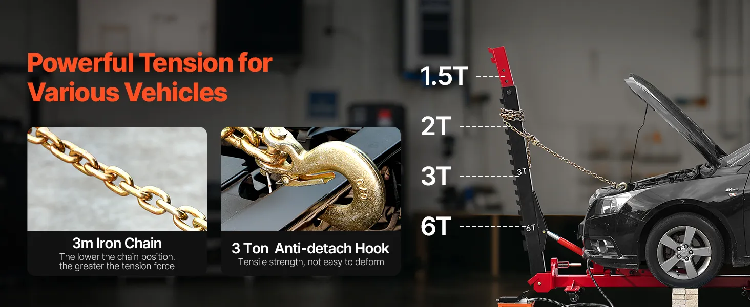 Tento vyťahovač rámov karosérií je vybavený vysokopevnostnou reťazou s dĺžkou 118 palcov / 3 m a 3-tonovým hákom proti odlepeniu. Maximálna ťahacia sila môže dosiahnuť až 6 ton, pričom sila ťahu sa zvyšuje s tým, ako sa reťaz ťahá smerom nadol.