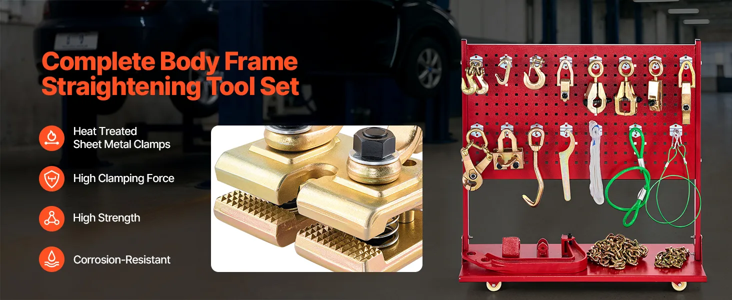 Naše zariadenie na opravu karosérie sa dodáva so 16 nástrojmi na rovnanie vrátane vysokokvalitných svoriek na plech, ktoré poskytujú silnú upínaciu silu a zabraňujú skĺznutiu. Dosiahnete ním rôzne potreby opravy karosérie!
