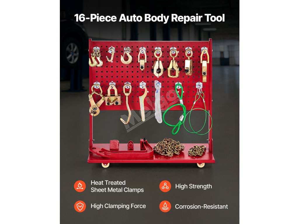 Naše zariadenie na opravu karosérie sa dodáva so 16 nástrojmi na rovnanie vrátane vysokokvalitných svoriek na plech, ktoré poskytujú silnú upínaciu silu a zabraňujú skĺznutiu. Dosiahnete ním rôzne potreby opravy karosérie!