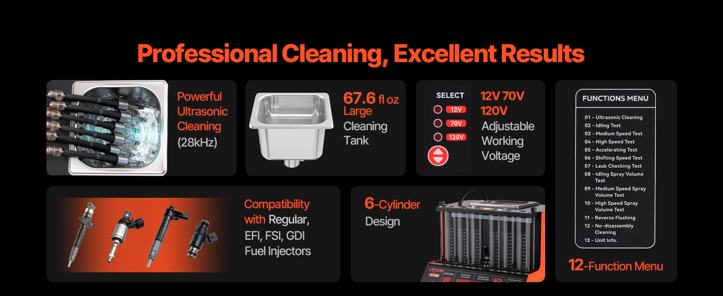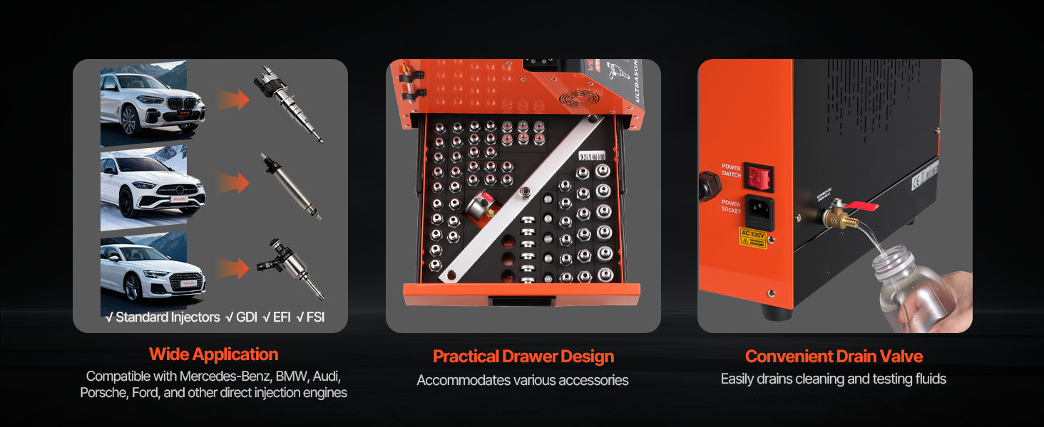 Tento čistič vstrekovacích ventilov ponúka 3 voliteľné napätia a je kompatibilný s vstrekovacími ventilmi EFI, FSI a GDI a podporuje motory Mercedes, BMW, Audi, Porsche, Ford a iné motory s priamym vstrekovaním.