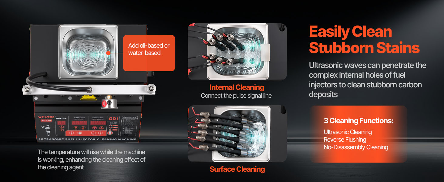 S 3 režimami čistenia a 9 testovacími funkciami tento čistič vstrekovacích ventilov obnovuje vstrekovacie ventily do obnoveného stavu.