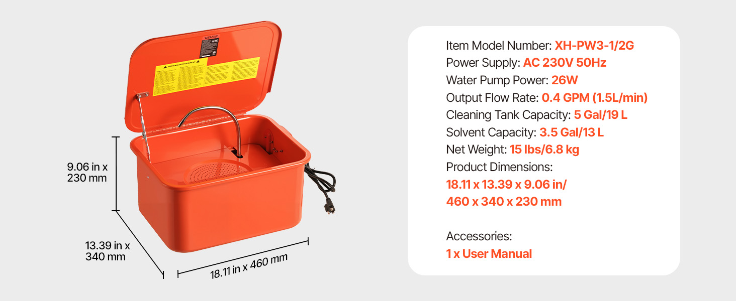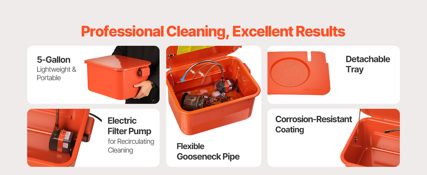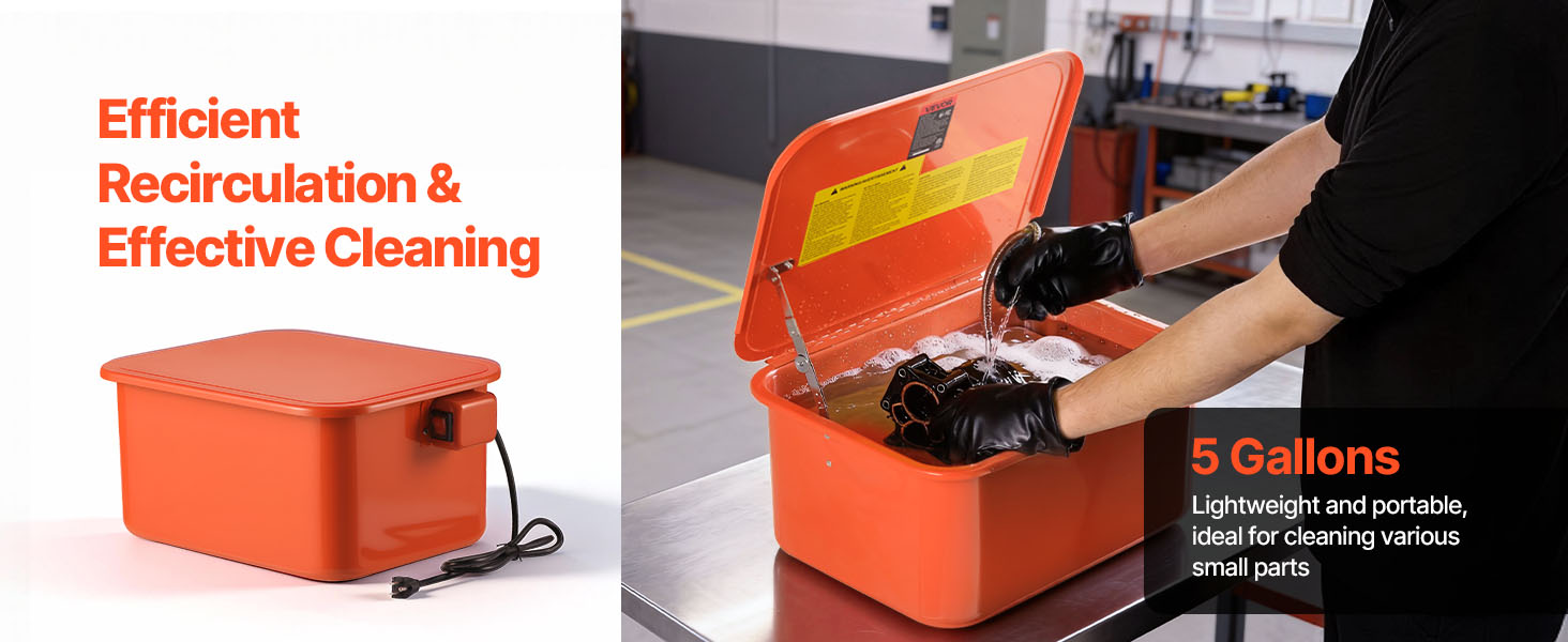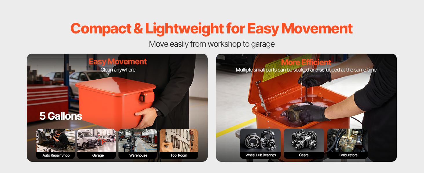 5-galónová umývačka dielov umožňuje súčasné čistenie viacerých automobilových dielov a bez námahy odstraňuje odolné mastnoty a nečistoty.