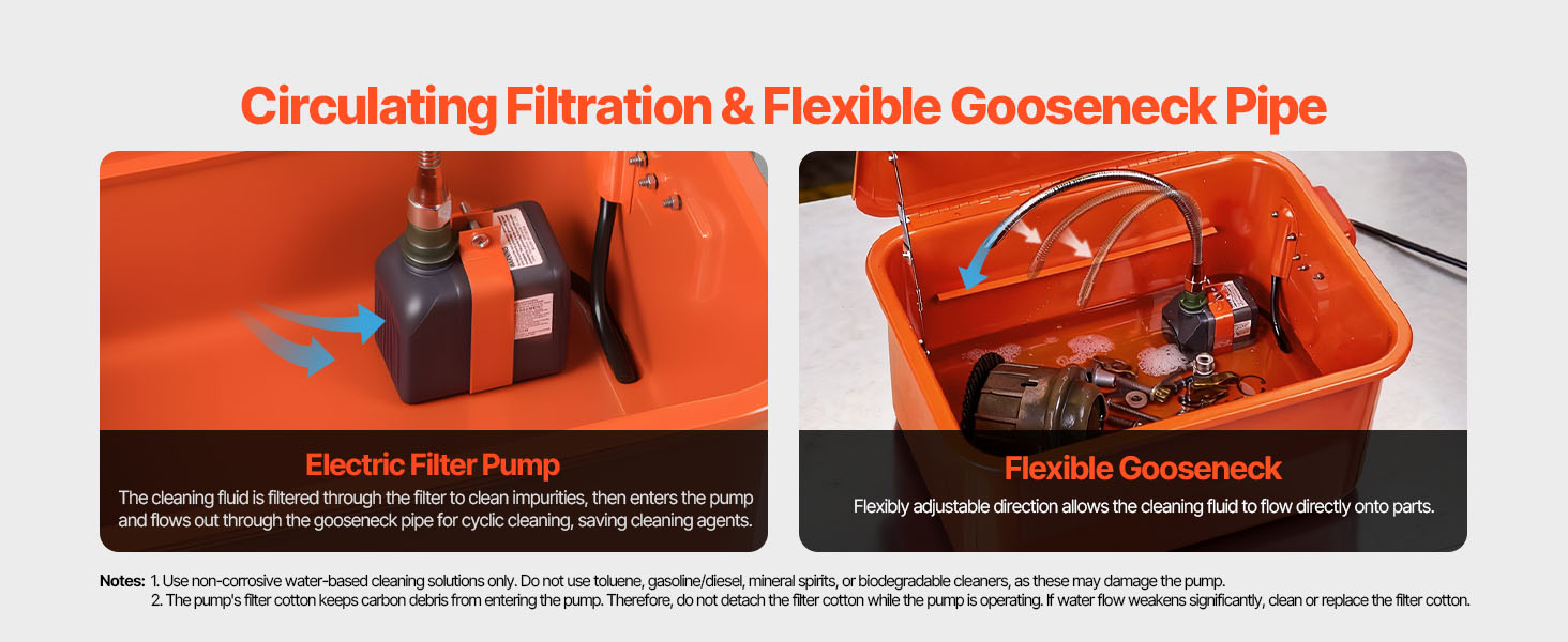 Naša umývačka automobilových dielov je vybavená elektrickým filtračným čerpadlom. Čistiaci roztok prechádza cez sieťový filter, potom vstupuje do čerpadla a vyteká cez husacie krky, kde sa opakuje cirkulácia. Nastaviteľné husacie krky zabezpečujú úplné pokrytie dielov čistiacim roztokom.