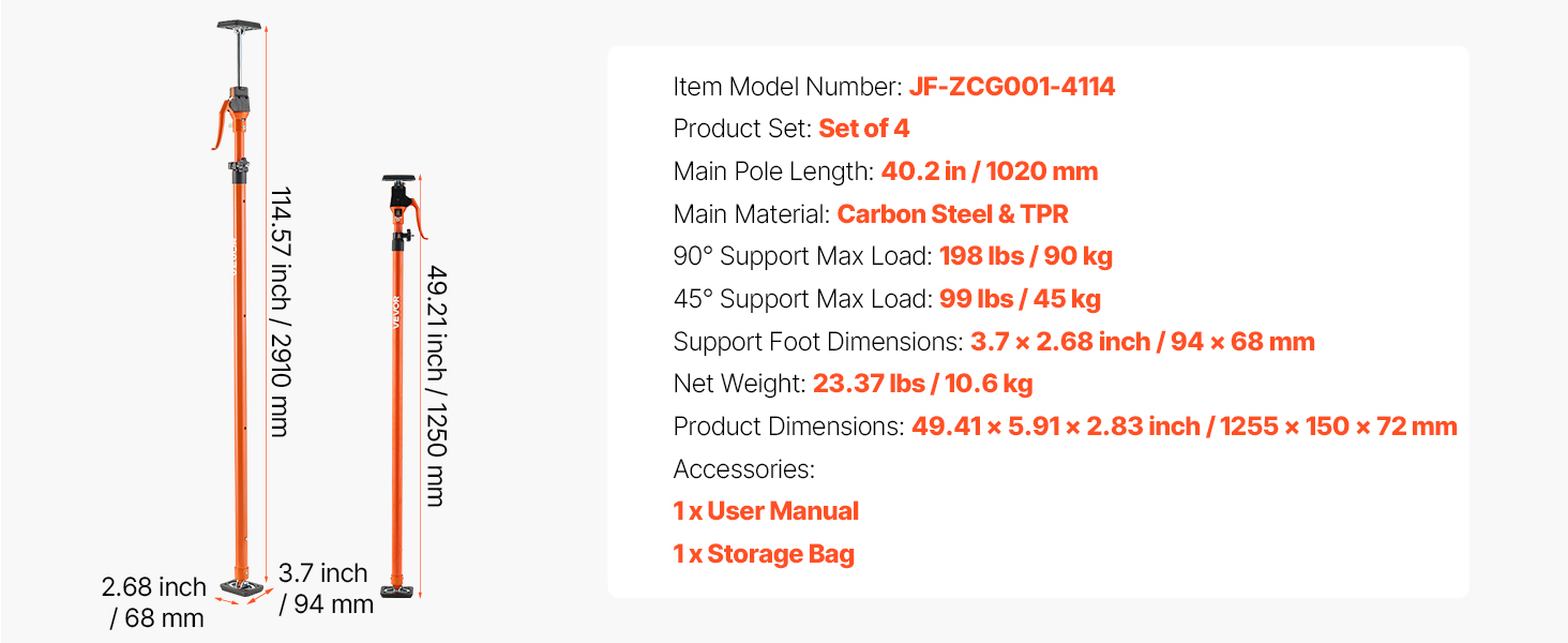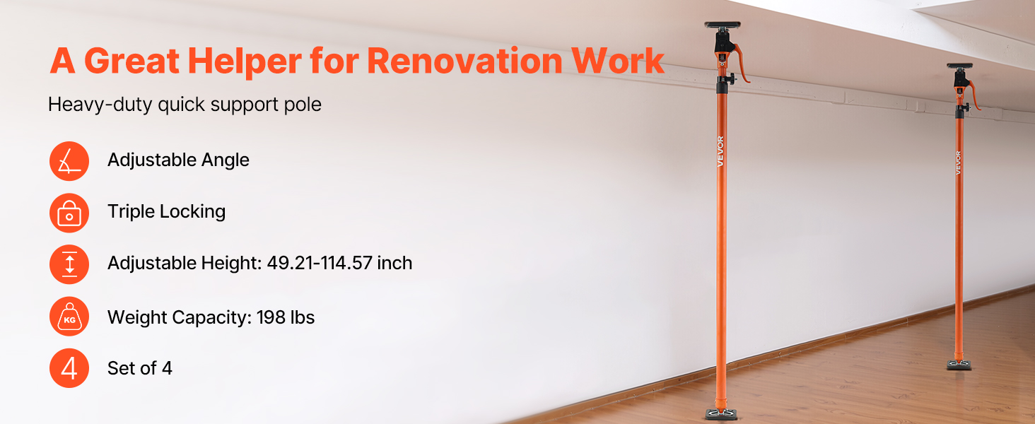 Táto súprava 4 ks podperných tyčí pre skrinky poskytuje účinnú podporu nákladu na stavbách, v skladoch a pri domácich projektoch. S nosnosťou 198 libier, nastaviteľnou výškou a bezpečným uzamykateľným dizajnom je ideálna na zdvíhanie alebo pridržiavanie skríň, sadrokartónových dosiek a ďalších predmetov.