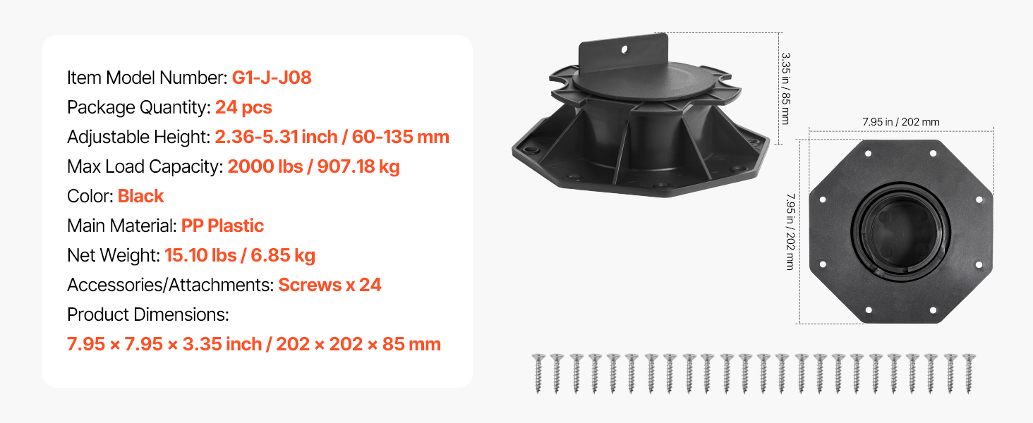 Trvanlivé a odolné voči vlhkosti a korózii sú naše podstavce na podopretie paluby vyrobené z vysokopevnostného PP materiálu. Dajú sa nastaviť v rozsahu od 2,36 do 5,31 palca, ľahšie sa inštalujú a premiestňujú ako tradičné drevené stĺpiky a sú ideálne na terasy, vonkajšie terasy, hojdacie plošiny, fontány a iné.