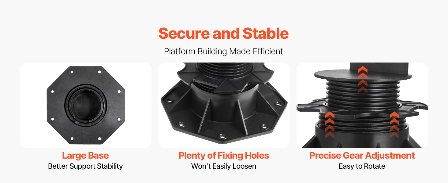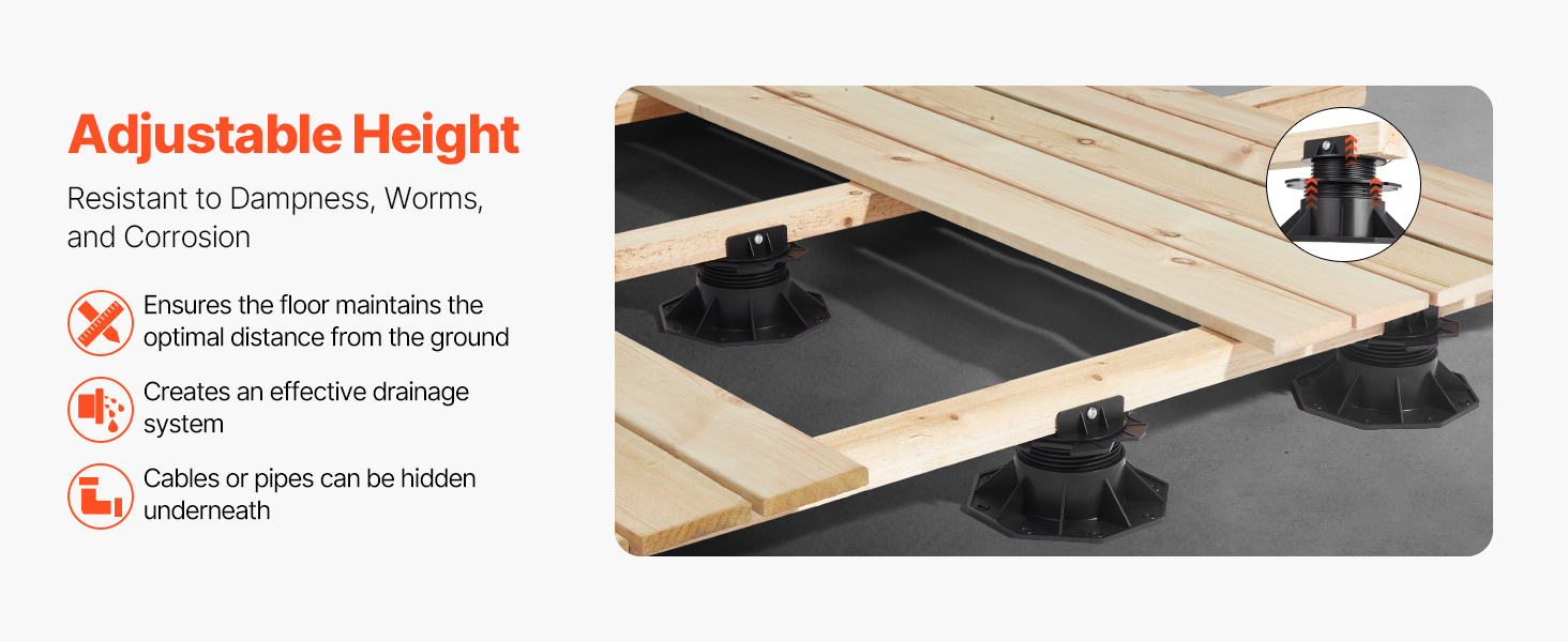 Náš nastaviteľný podstavec na podopretie paluby udržiava ideálnu vzdialenosť od zeme, čím izoluje vlhkosť a vytvára účinný drenážny systém. Zabraňuje poškodeniu dreva vlhkosťou a korózii a zároveň ukrýva káble alebo potrubia pre väčšiu bezpečnosť a odolnosť.